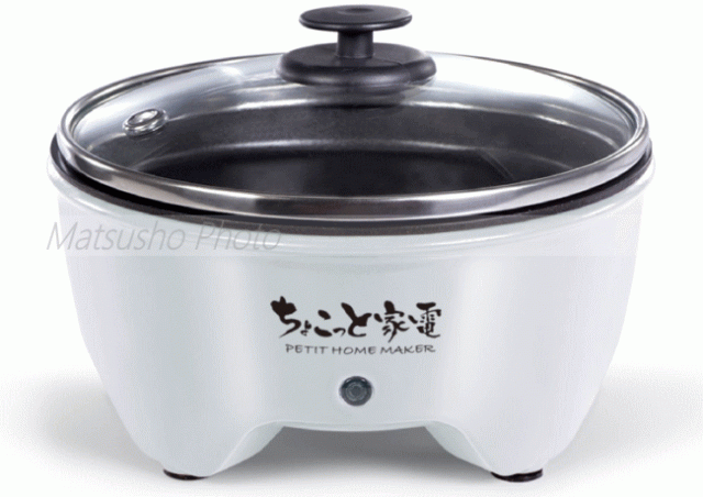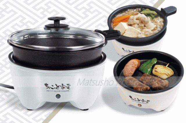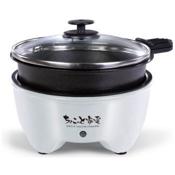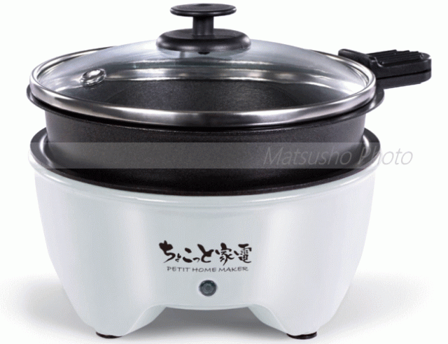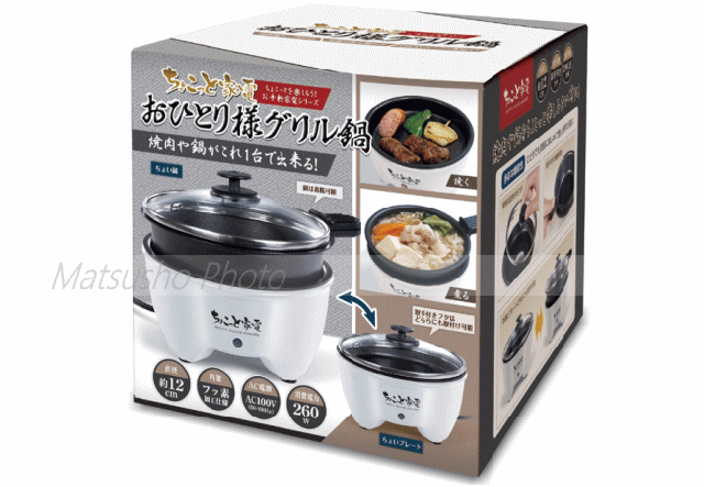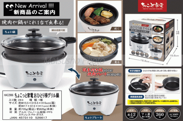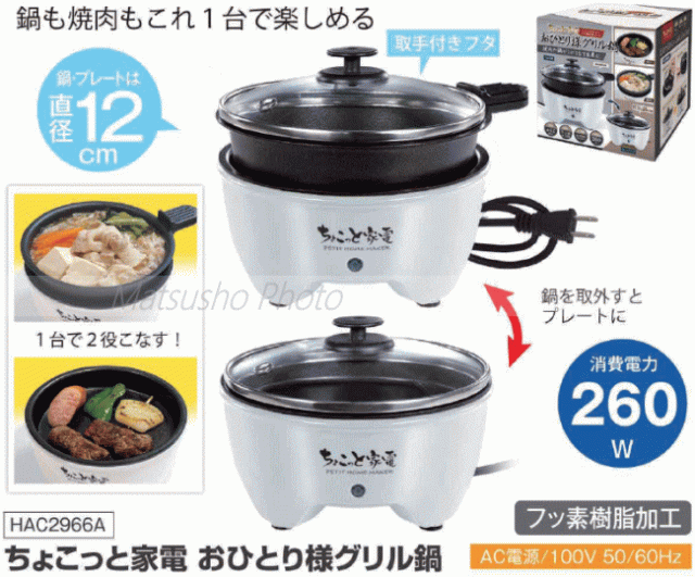 鍋も焼肉もこの1台で楽しめる1人用の鍋&グリルプレートセット。直径約12cmの卓上サイズなので1人での晩酌にも手軽にご使用できます。使い方はとっても簡単、取手付き鍋を外すだけで焼肉プレートに早変わり。ひとりでも気軽に楽しめて使い勝手が良い!焦げ付きにくいフッ素加工で表面をこんがりと焼き上げます。■品番HAC2966■サイズ[本体]約W17×D13×H12cm[箱]約W15.5×D15.5×H15cm■プレート直径約Φ12cm(プレート/取手付き鍋共に)■重量[本体]約620g[箱込]約735g■電源AC100V 50/60Hz■消費電力260W■プレート最高温度約190℃(取手付き鍋)、約200℃(本体プレート)※温度調節不可■主材質:アルミ・フェノール樹脂・PPS・ステンレス・PA・ガラス■カラー:ホワイト■セット内容:グリルプレート本体×1台、取手付き鍋×1個、取手付きフタ×1個、取扱説明書×1※取手付き鍋は取り外し可能ですが本体のプレートは取り外しができません。本製品は温度調節ができません。本製品には電源スイッチはありません。本製品は家庭用です。