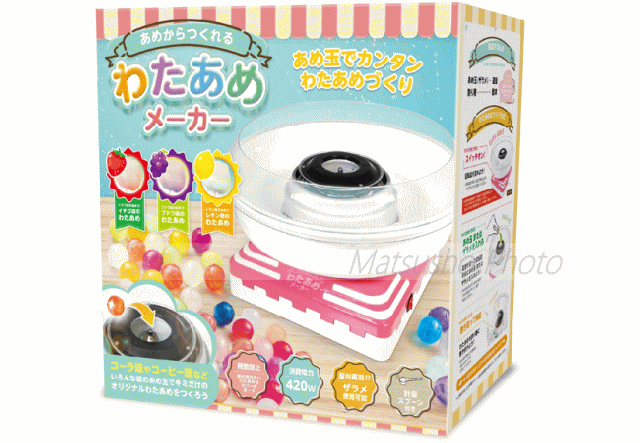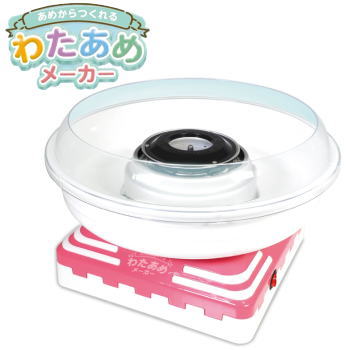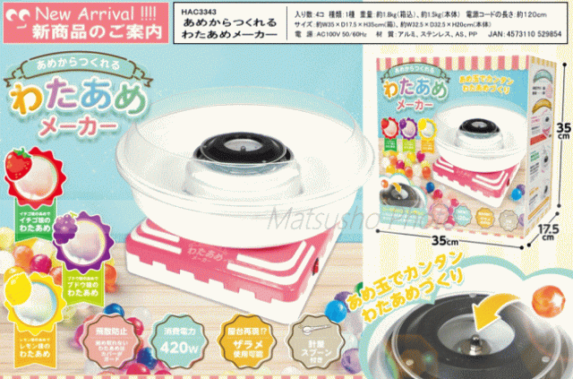 おうちで簡単にあめから作れる楽しいわたあめメーカー♪市販のキャンディー飴、またはザラメを入れるだけでフワフワの可愛いわたあめが作れます。色々な味のキャンディ飴を試してカラフルで美味しい自分だけのわたあめを作ってみよう♪■品番HAC3343■サイズ[本体]約W32.5×D32.5×H20cm[箱]約W35×D17.5×H35cm■重量[本体]約1.5kg■電源AC100V 50/60Hz■消費電力420W■連続使用時間約30分■主材質:アルミ・アクリル・AS・PP■カラー:ピンク■セット内容:本体×1台、計量スプーン×1個、取扱説明書×1※連続使用時間は必ずお守り下さい。本製品は一般家庭用です。わたあめが出来る時間やザラメが温まる時間は目安です。ザラメの量や使用環境(部屋の温度・湿度)により異なります。ザラメや割り箸、飴は付属されていません。次の商品は使用できません。ソーダ—パウダー(重曹など)の入ったあめ玉・乳脂肪類(バター、ミルクなど)の入ったあめ玉・落花生など異物が入ったあめ玉・あめ玉、ザラメ、グラニュー糖以外の商品(ソフトキャンディー含む)
