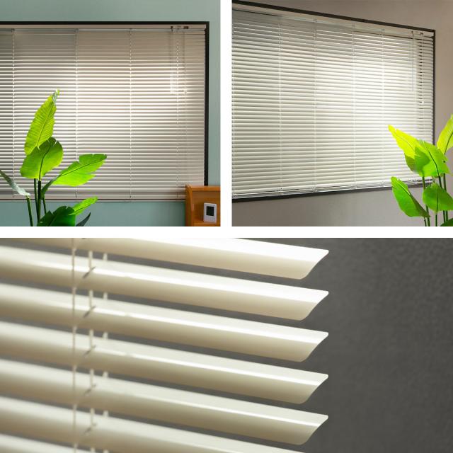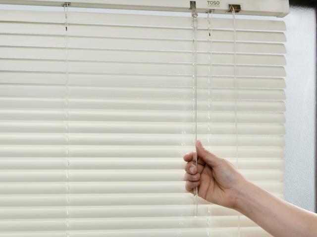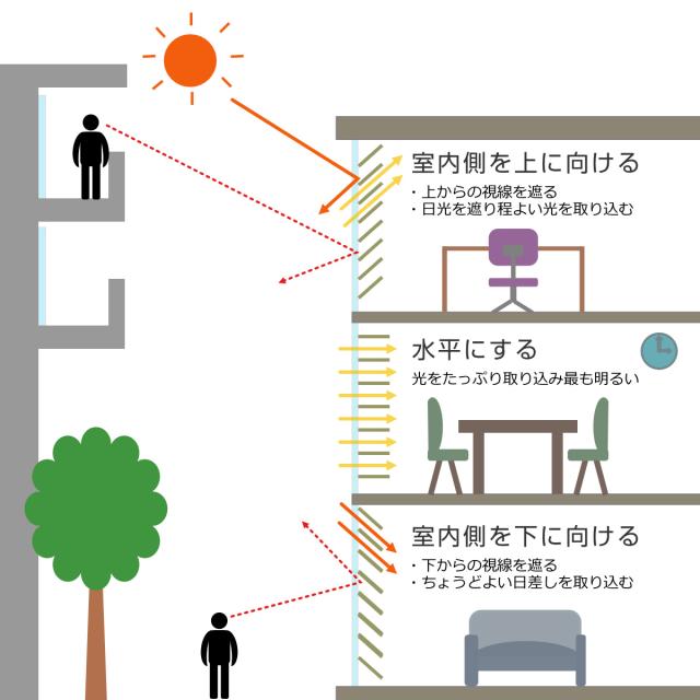 ブラインドはスラットの角度によって日射を遮りながら風を通したり、外部の視線をコントロールする事ができます。室内側を上に向けると上からの視線を遮り、夏には強い直射日光を遮ります。室内側を下に向けると下からの視線を遮り、冬には丁度良い日差しを取り込みます。また、水平にすると光をたっぷり取り込むことができます。