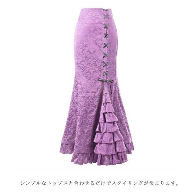 | マーメイドシルエットとレースアップデザインが女性らしいロングスカート。 裾のティアードが動くたびに上品に揺れ動く綺麗めシルエットのスカート。 程よい広がりのマーメイドスカートでスタイルアップ効果も叶います! 高級感のあるジャガード柄がコーデの主役に シンプルなトップスと合わせるだけでスタイリングが決まります。 | |