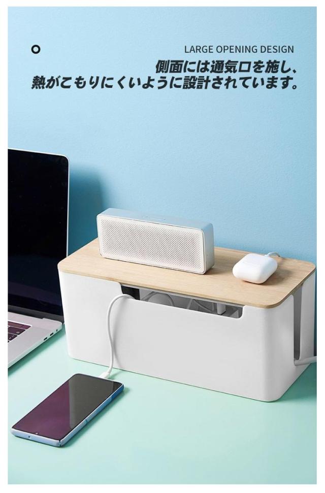 | シンプルながらスタイリッシュなケーブルボックス。 蓋付きでホコリが溜まりにくく、蓋の上に小物を置くこともできます。 無駄のないシンプルなデザインで、部屋に馴染みます。 側面には通気口を施し、熱がこもりにくいように設計されています。 | |