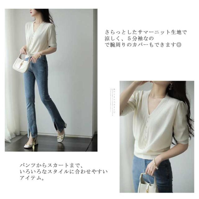 全4色×6サイズ!ニットソー 5分袖 春 ニット トップス 送料無料 レディース サマーニット 半袖ニット vネック パール付き キレイめ オフィス 大人 上品 無地 可愛い 夏 秋