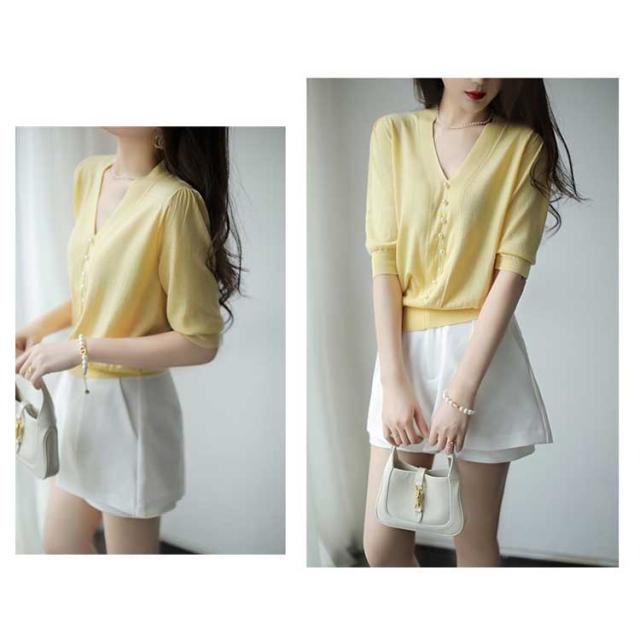 | 全4色×6サイズ!フロントにあしらわれたパールボタンがかわいいニットトップス。 すっきりとしたVネックがデコルテラインを美しく見せてくれるので、シンプルながらも女性らしい印象を作り上げます。 シンプルかつ上品なデザインなので、デイリー使いはもちろんオフィスカジュアルにもシーンを選ばず着用できます! さらっとしたサマーニット生地で涼しく、5分袖なので腕周りのカバーもできます◎ 軽くてソフトな素材感が、上品で大人な抜け感を演出。 パンツからスカートまで、いろいろなスタイルに合わせやすいアイテム。 | |