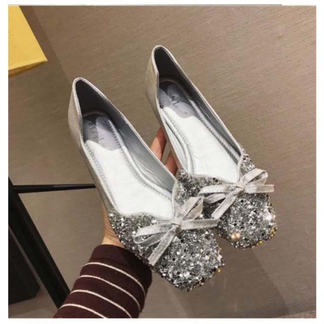 | ぺたんこソールなのに大人可愛い輝くをまとった煌めくパンプス。 定番のリボンデザインにスクエアトゥでトレンド感をプラス。 グリッターがキラキラと輝き、足元が一気に華やかな印象に。 特別なシーンにはもちろん、デイリー使いのアクセントにも。 若干、大き目のシューズです。 | |