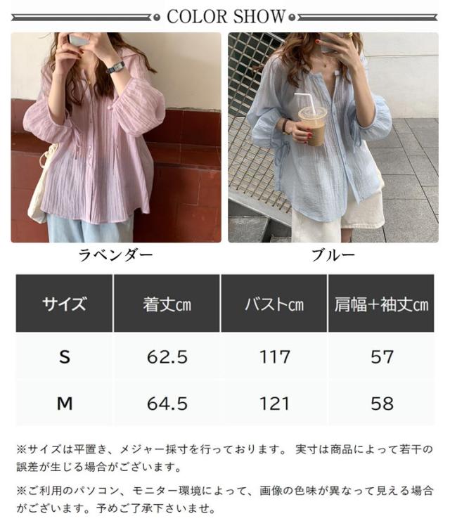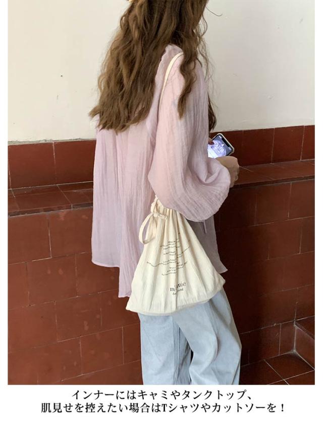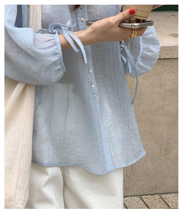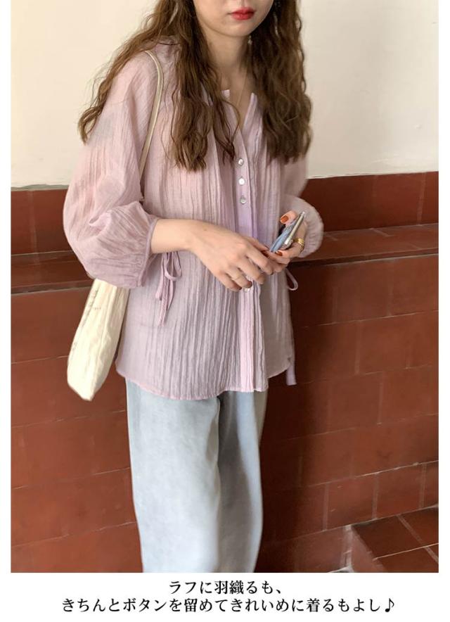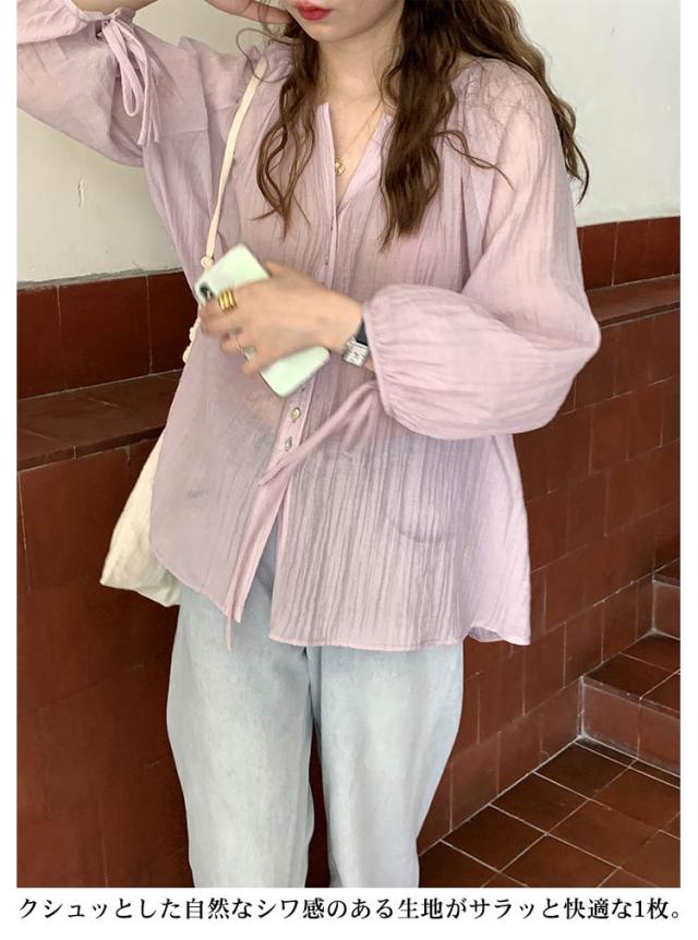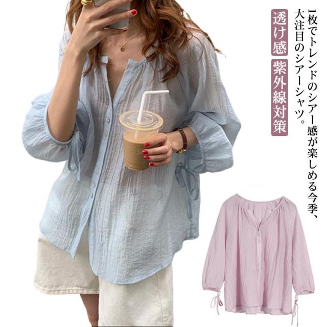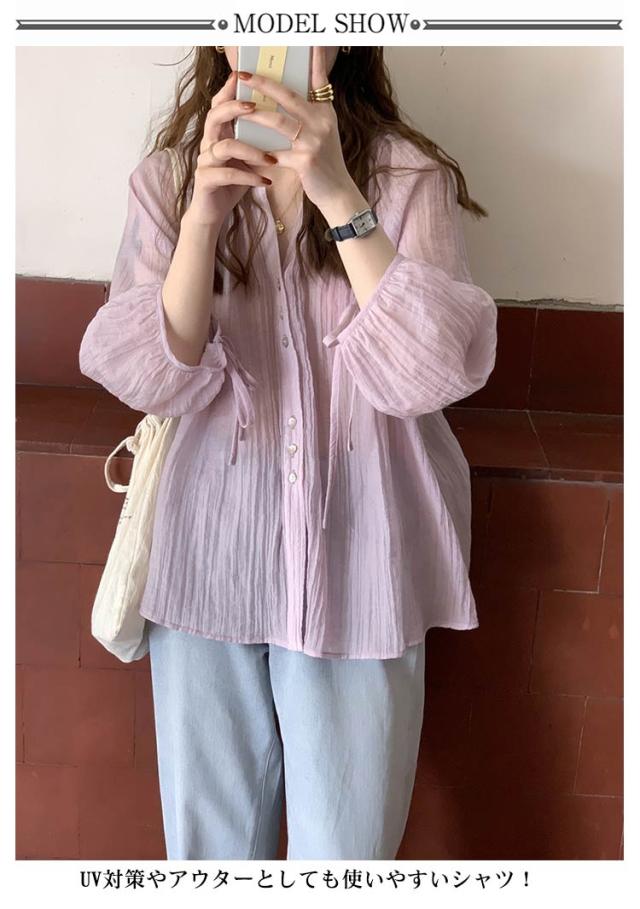 シャツ レディース ブラウス 袖リボン トップス 前開き フロントボタン 薄手 透け感 ゆったり 紫外線対策 冷房 日差し対策 長袖 羽織り カジュアル 着回し おしゃれ トレンド 夏 無地 全2色