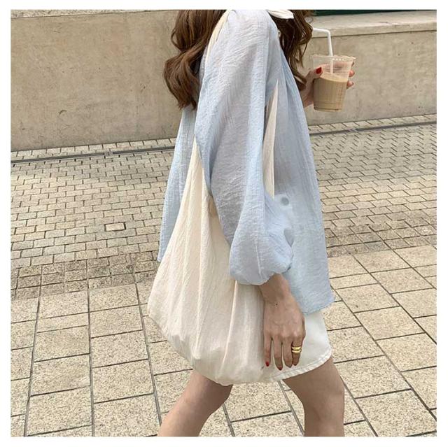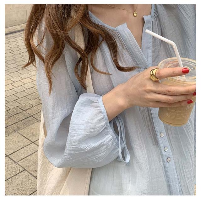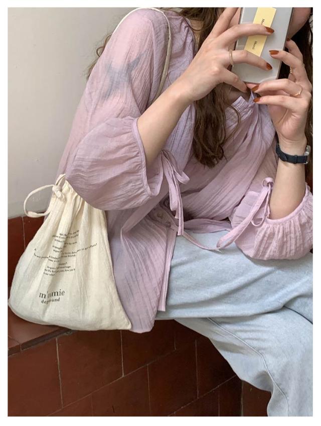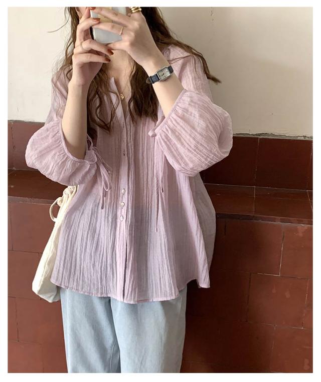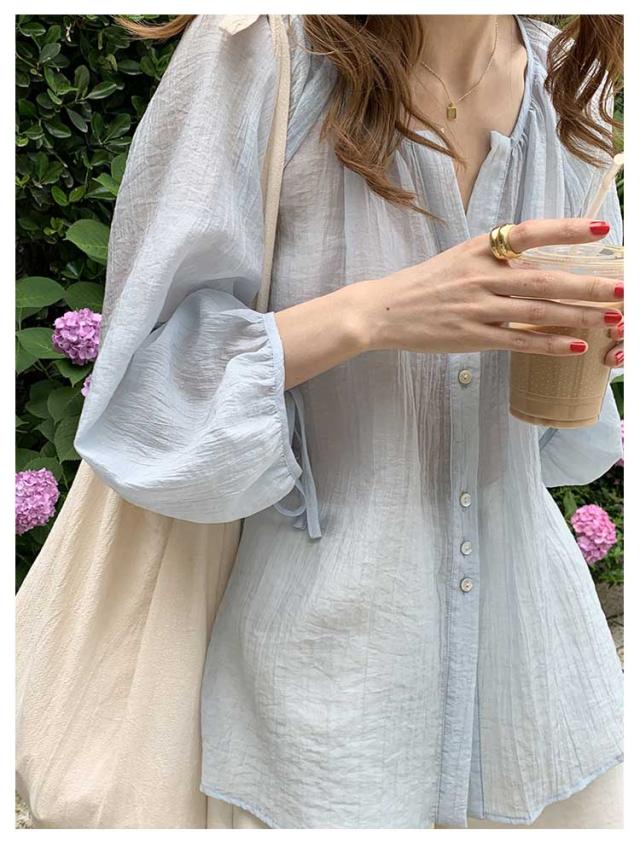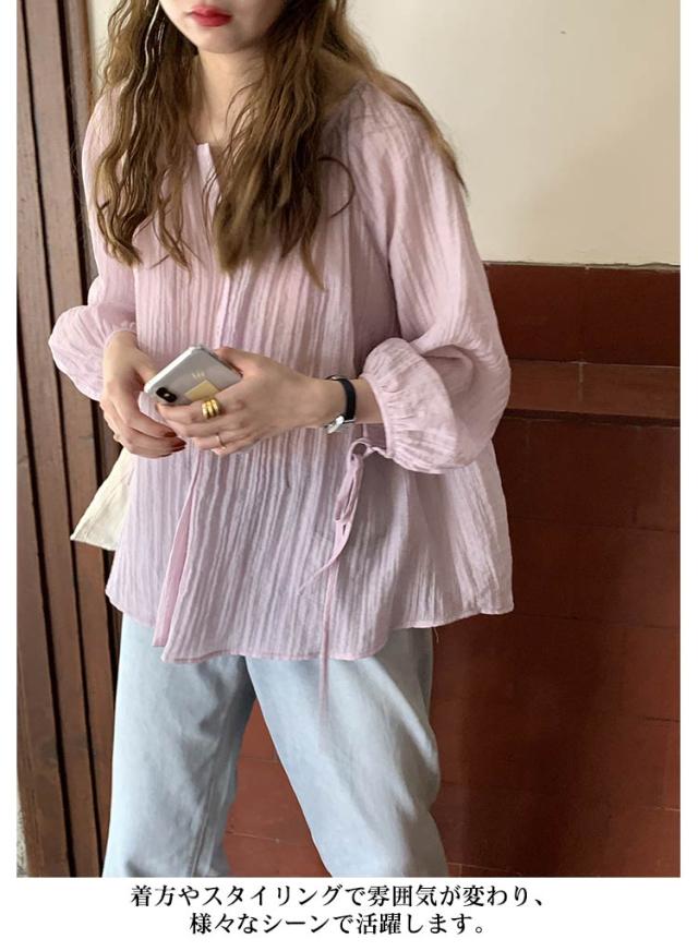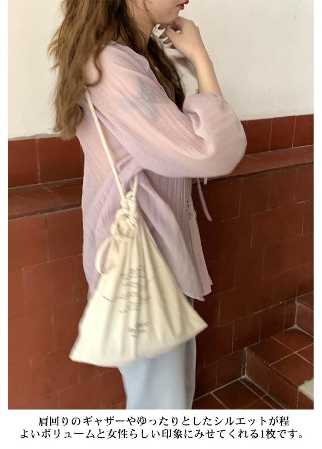 シャツ レディース ブラウス 袖リボン トップス 前開き フロントボタン 薄手 透け感 ゆったり 紫外線対策 冷房 日差し対策 長袖 羽織り カジュアル 着回し おしゃれ トレンド 夏 無地 全2色