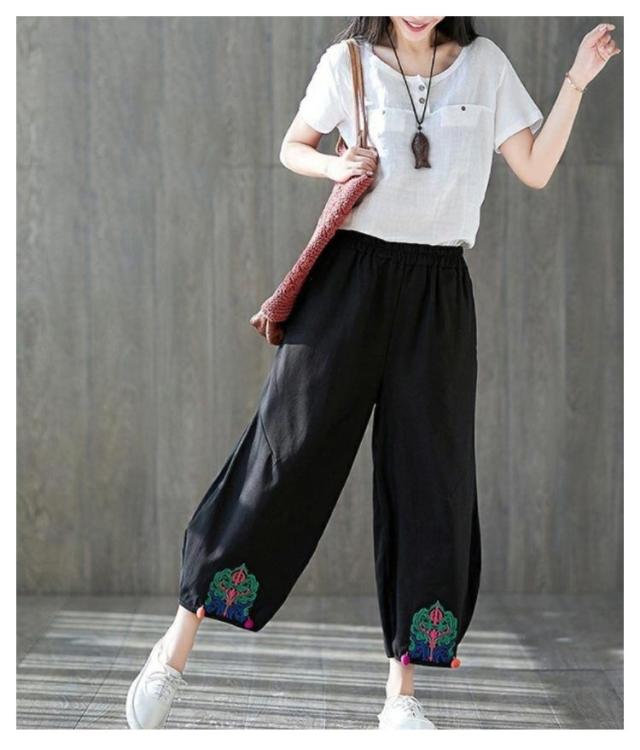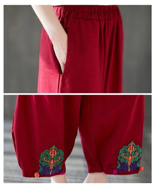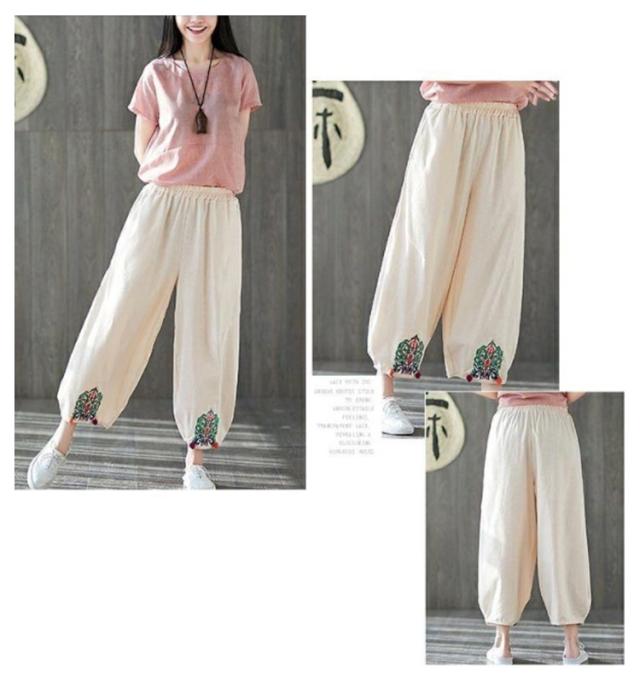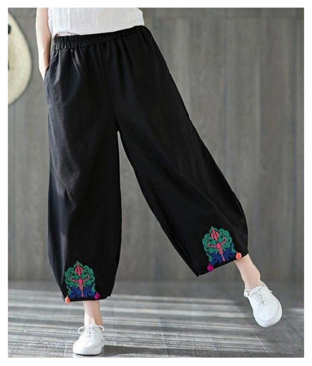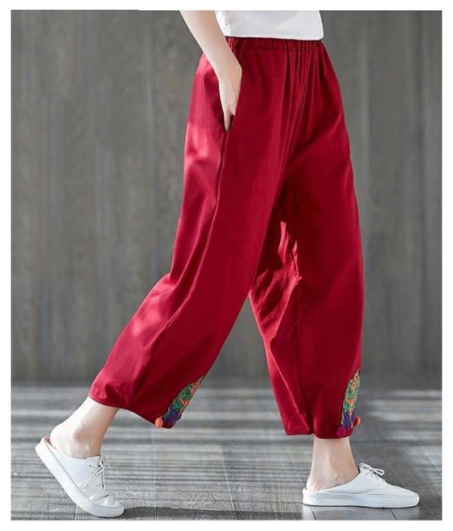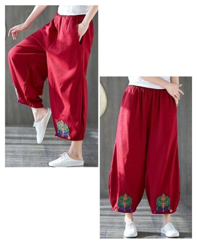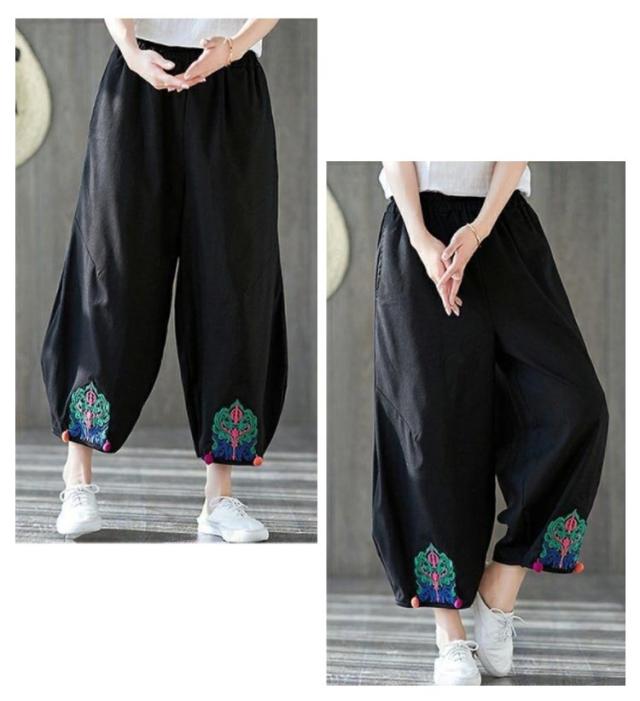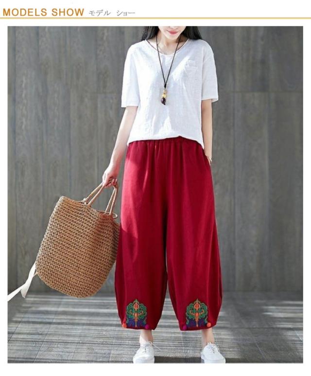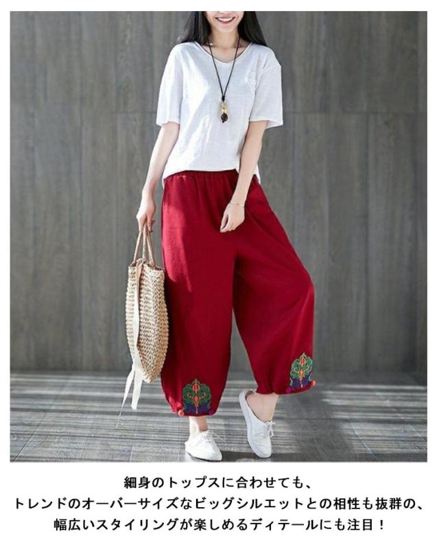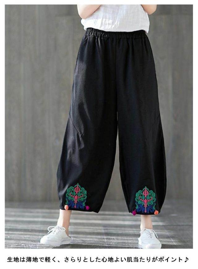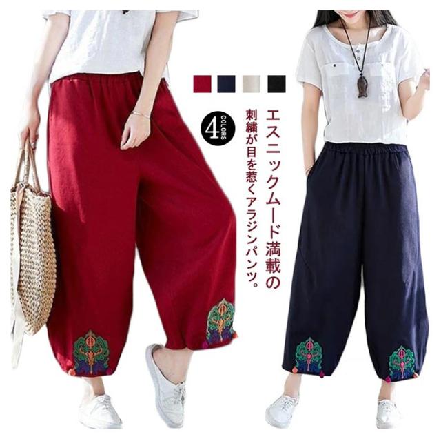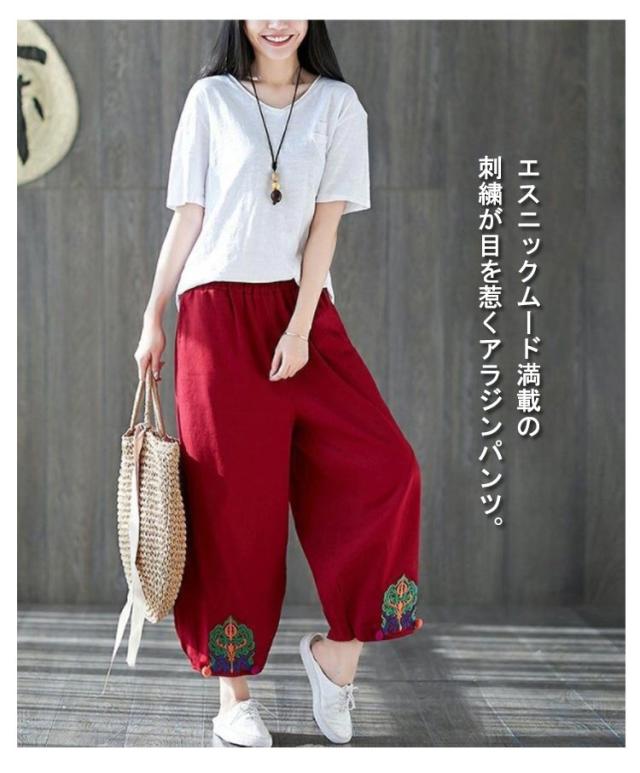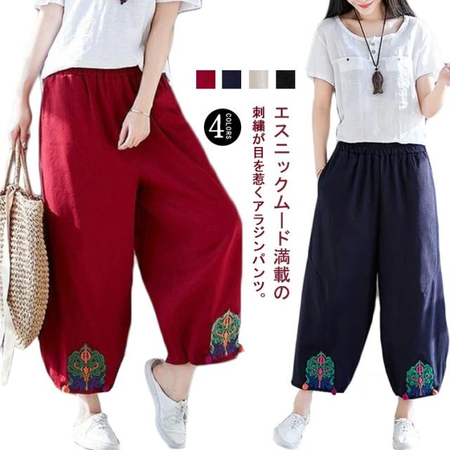 エスニック パンツ 刺繍 民族柄 ワイドパンツ 送料無料 レディース カジュアルパンツ 9分丈 アラジンパンツ エスニック 個性的 ボトムス 春服 夏服 秋服 体型カバー ウエストゴム