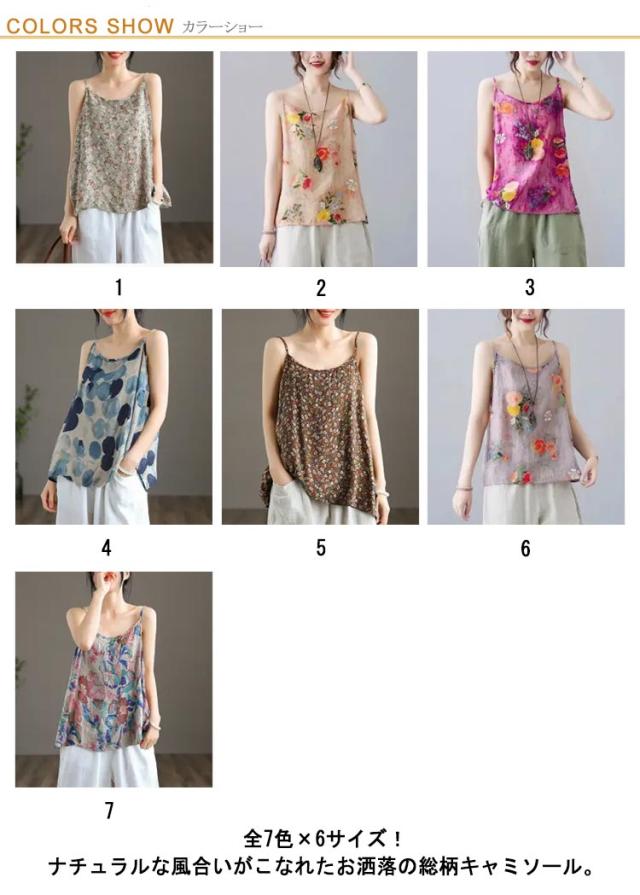 | 全7色×6サイズ!ナチュラルな風合いがこなれたお洒落の総柄キャミソール。 体のラインを拾わなくゆったりした着心地で快適に着こなせます。 快適素材で汗をかいても快適で、素肌のように着用できる。リラックスして過ごしたいおうち時間にも。 1枚上にトップスを合わせればレイヤードスタイルにも着回しできます。 | |