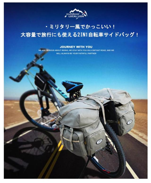 | ・ミリタリー風でかっこいい!大容量で旅行にも使える2in1自転車サイドバッグ! ・ミリタリー風の外観が特徴的かつ、長期の自転車旅行にも使える50Lの大容量モデルです。 ・撥水性に優れた丈夫な素材が使用されていて、防水カバーまでついています。 ・反射ステッカーも縫い付けられているので、夜間に自転車走行しているときも車から見えやすく安全です。 ・高品質なフックとベルトでしっかりと固定でき、取り付けと取り外しが簡単。 ・ほとんどのマウンテンバイク、ロードバイク、通勤用バイクに適しています。 ・黒・グレイ・カーキや迷彩柄など、好きなカラーを選択できるのも嬉しいポイントです。 | |