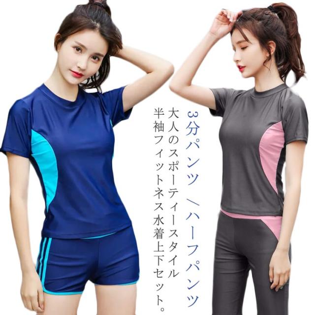 送料無料 フィットネス水着 レディース 大きいサイズ 上下セット セパレート 体型カバー 半袖 女性 競泳水着 ママ水着 中学生 高校生 スポーティー 色切り替え おしゃれ プルオーバー 20代 30代 40代 50代 60代