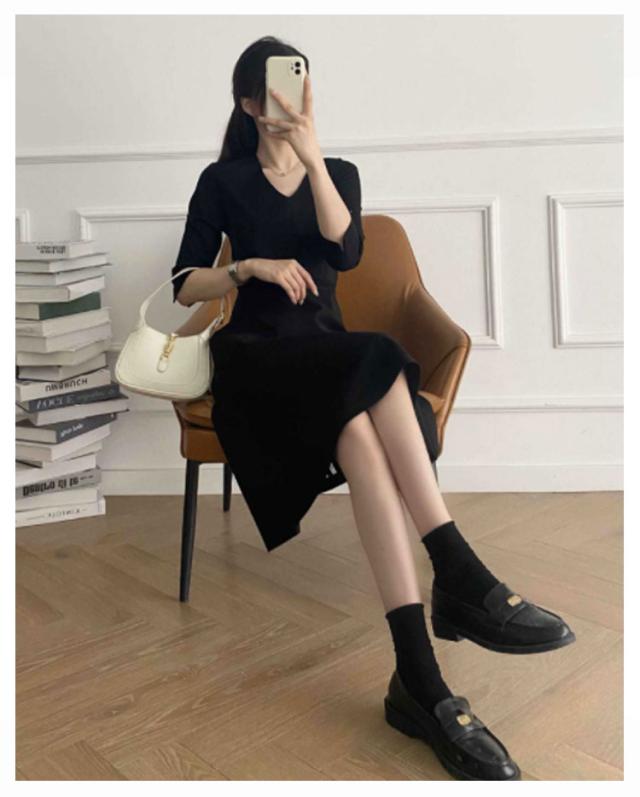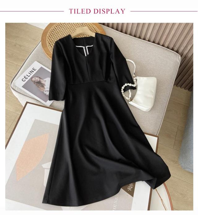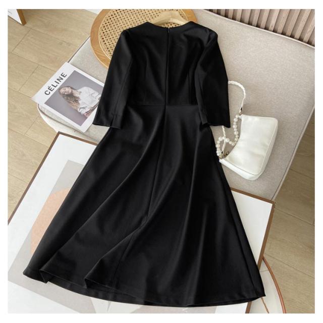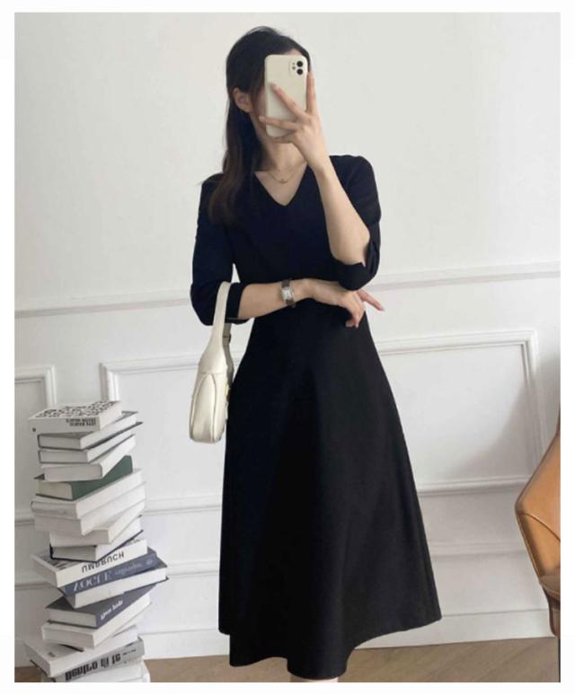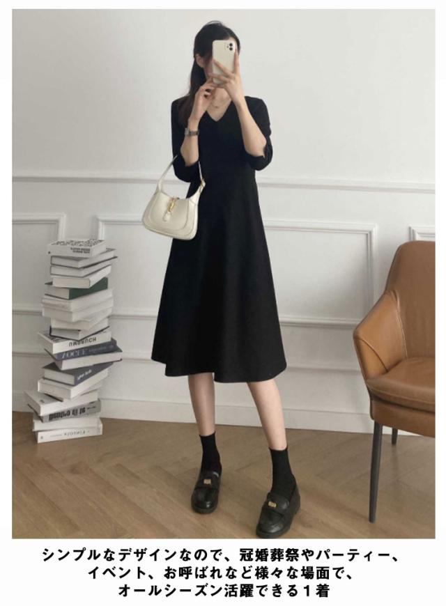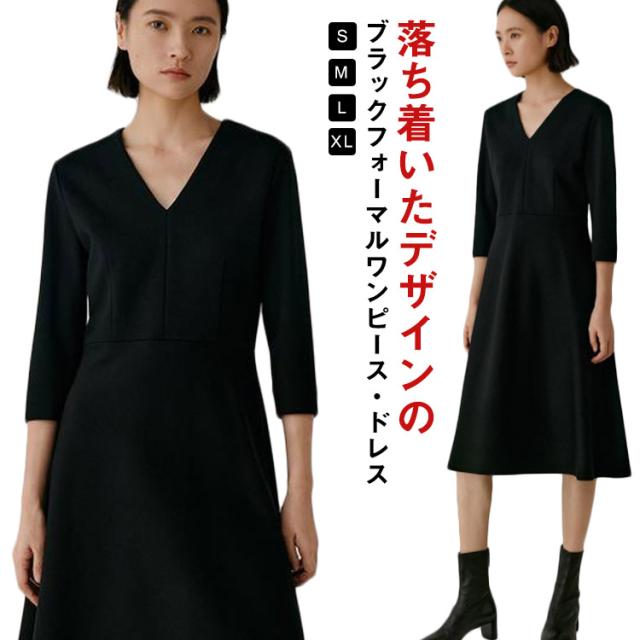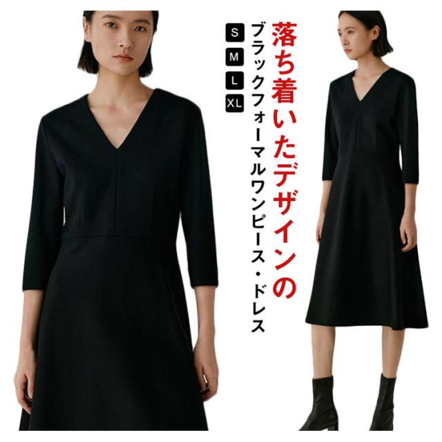 ワンピース ロング丈 フォーマル 黒 七分袖 レディース Vネック フレア Aライン ブラック ドレス 大人 美人 着痩せ 無地 ポケット付き 通勤 シンプル おしゃれ 可愛い パーティー 冠婚葬祭 二次会 演奏会 上品 喪服 葬式