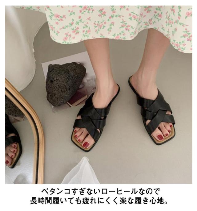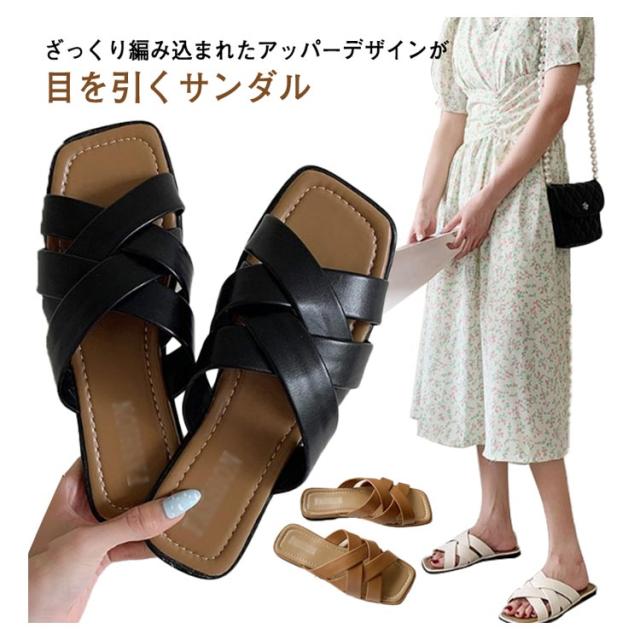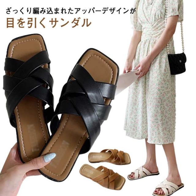 サンダル グルカ ミュール スクエアトゥ 編み込み レディース つっかけ スリッパサンダル ぺたんこ シューズ 春夏 グルカサンダル メッシュサンダル 小さいサイズ 大きいサイズ 春 夏 ホワイト ブラック キャメル