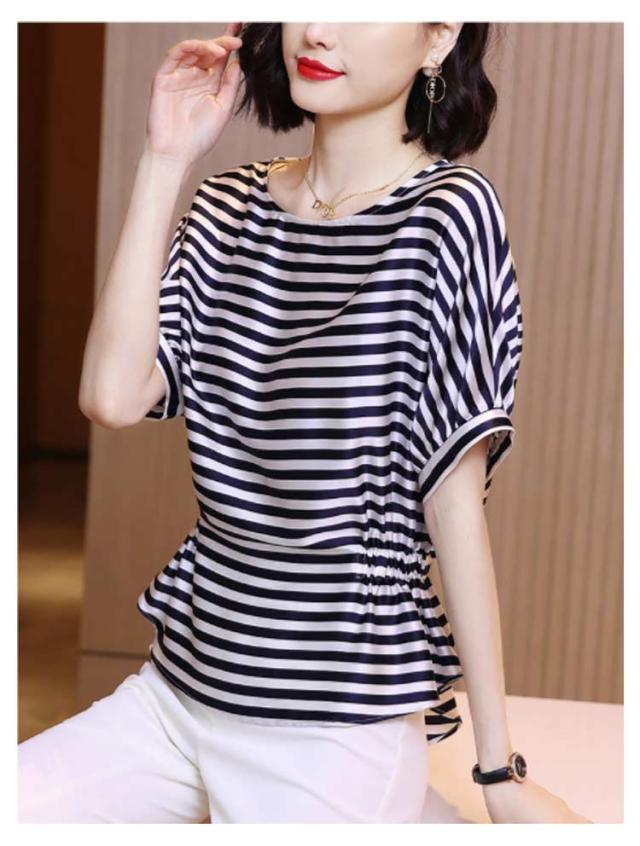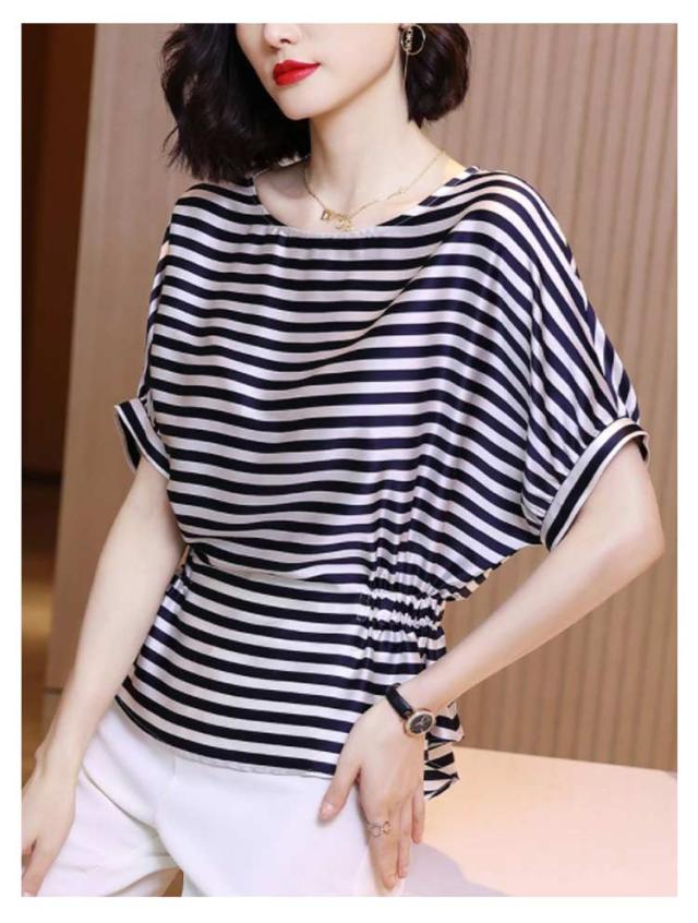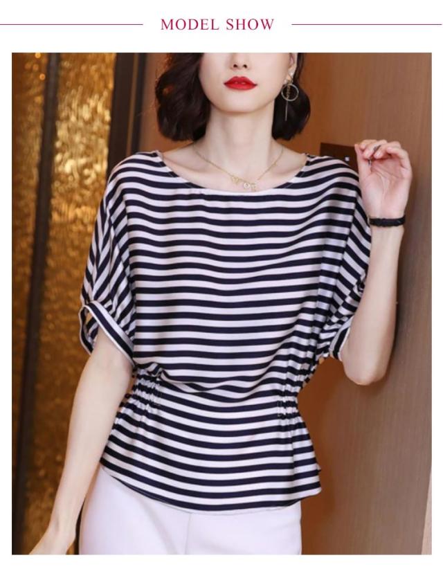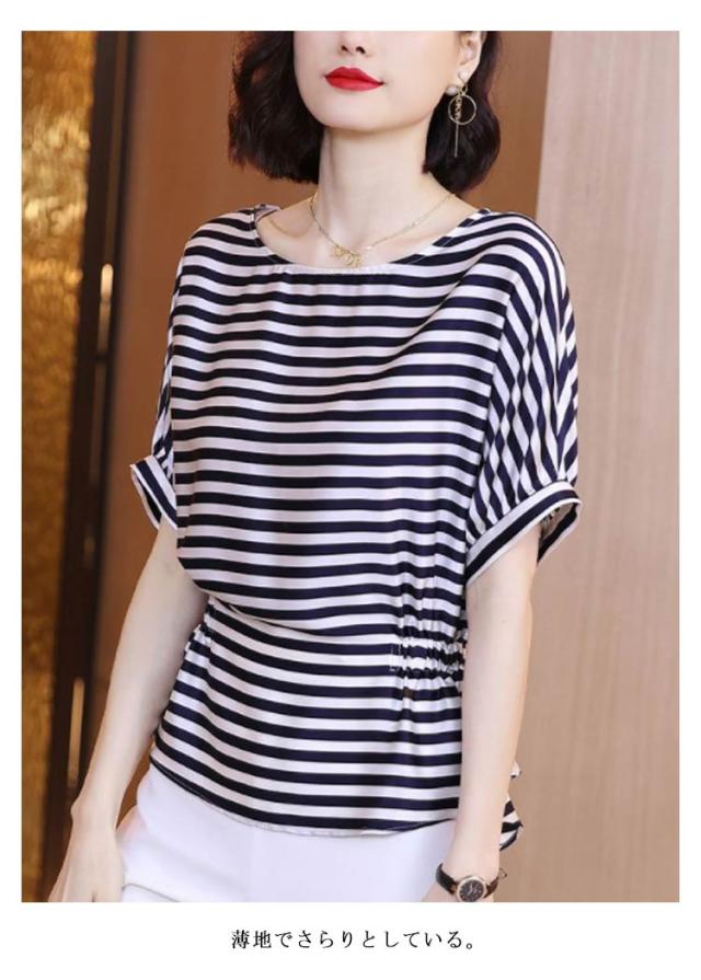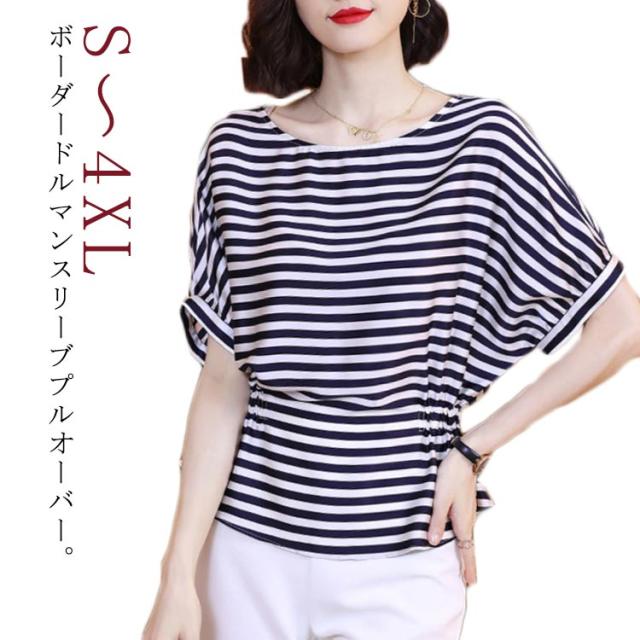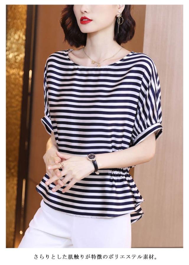 Tシャツ レディース 春 半袖 ボーダー ドルマンスリーブ 送料無料 シルク調 トップス プルオーバー シンプル カットソー ゆったり 体型カバー ファッション 30代 20代 40代 クルーネック ラウンドネック ボーダー ドルマンスリーブ