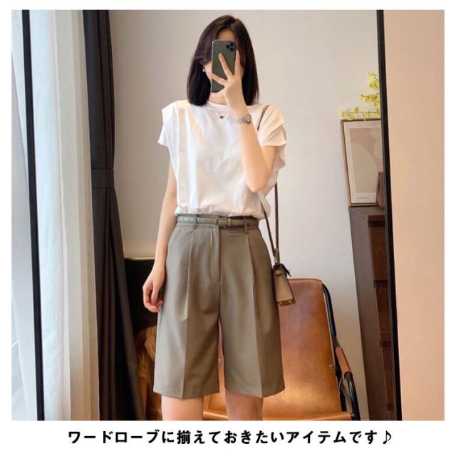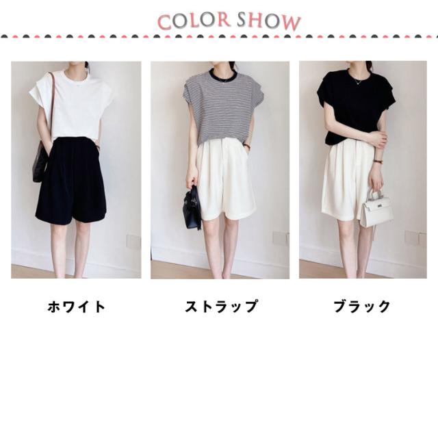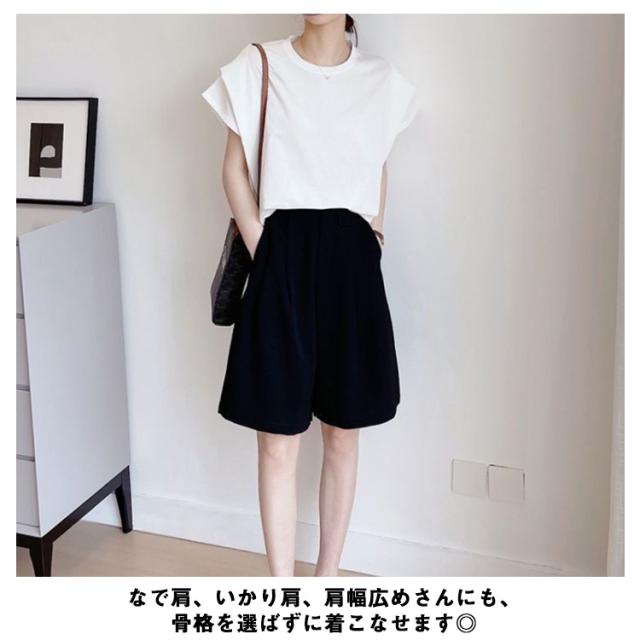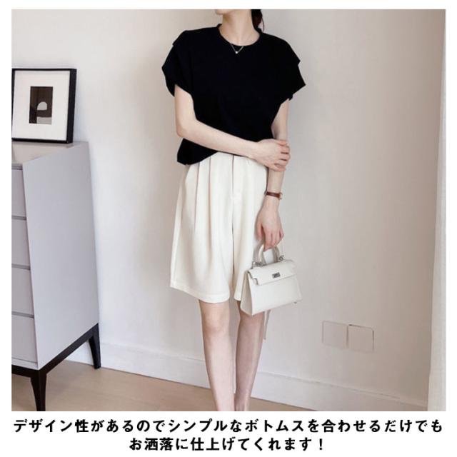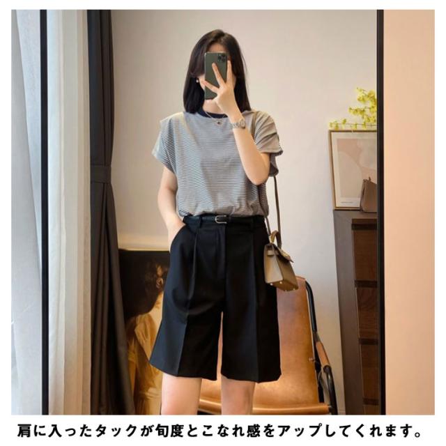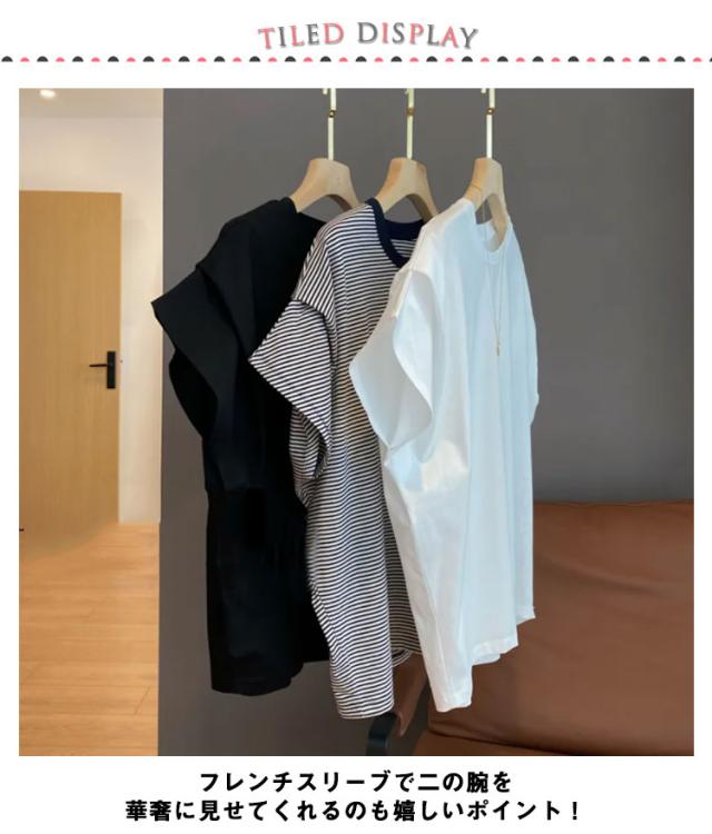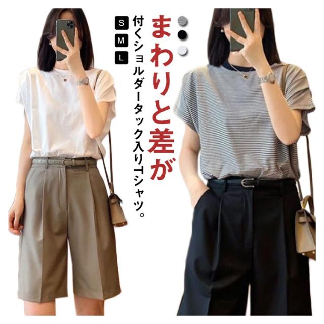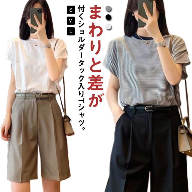 Tシャツ レディース 半袖 トップス 夏 肩タック ショルダータック タック 韓国 シンプル カジュアル 春 ボーダー Uネック ストラップ柄 無地 ラウンドネック 白 黒 お洒落 ゆったり 通勤 OL 可愛い インナー 重ね着 レイヤード フリル 大きいサイズ 20代 30代 送料無料