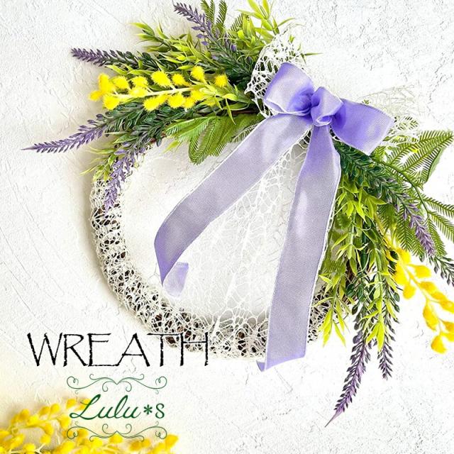 人気のラベンダーとミモザを入れたリース。リース台には白いリボンを巻き、明るいプロヴァンスをイメージした色合いに仕上げました。リース台20cm。ドア飾りにぴったりです。