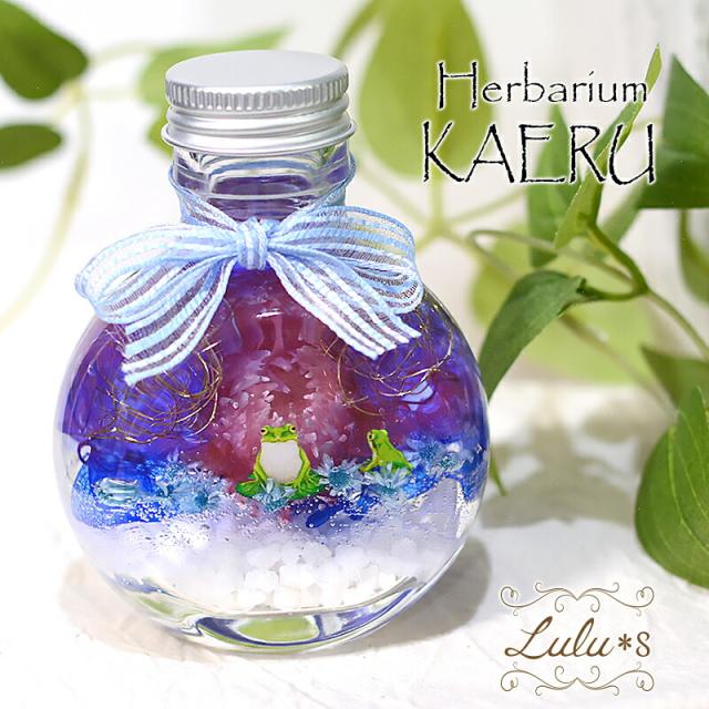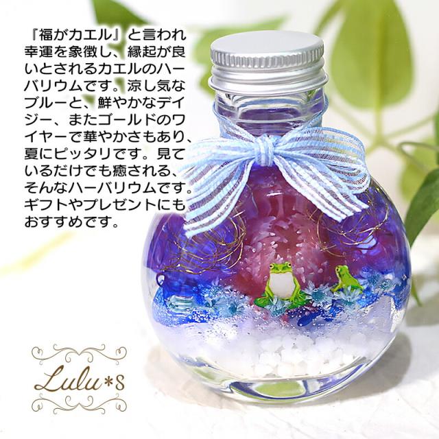 デイジーとカエルのハーバリウム プリザーブドフラワー ドライフラワー 可愛い 誕生日 プレゼント 母の日 父の日 ギフト 入学 卒業 入社 退職 カエル 蛙 パープル ブルー 紫 青 水槽 デイジー Lulu's-0558