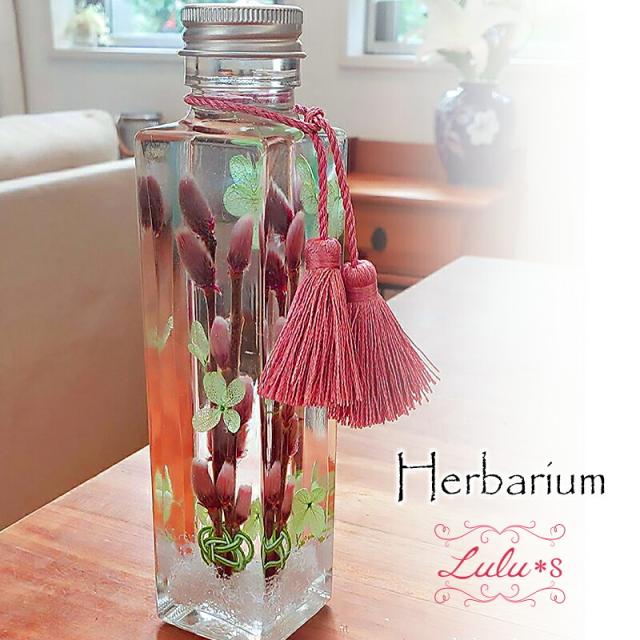 ネコヤナギとお抹茶水引のハーバリウム プリザーブドフラワー ドライフラワー ボトルサイズ:幅4cm×奥行4cm×高さ17cm 150ml lulus-1583 Lulu*s ルルズ