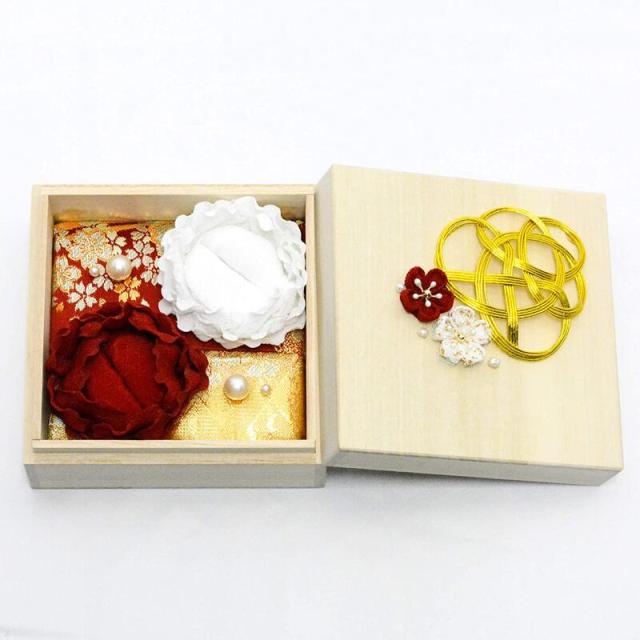 つまみ細工にて制作した花のモチーフのリングピローとなります。サテンの生地のところにリングが入るものとなります。 晴れの日の御演出に、また、お式後も大切なジュエリーを保管できるようお箱は桐を使用しております。 箱の蓋には水引にて亀甲の細工をしております。 末永くお幸せにという気持ちを込めてお作りした作品となります