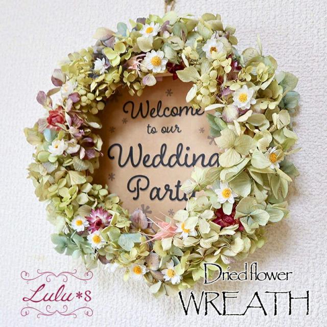 ボリューミーな紫陽花のドライフラワーをメインに可愛らしい小花を散りばめたウェルカムリースです。爽やかなボリュームたっぷりのリースとナチュラルなクラフト紙のメッセージボードを合わせました。ウェディングのお迎えのシーンにぴったりです! ウェルカムスペースにはもちろん、受付やウェイティングルームなどに飾っても可愛らしく素敵です。ちょっとした心遣い、爽やかなグリーンのアジサイがさりげない可愛らしさを演出します。 終わりのない形のリースは 「永遠」の幸せという意味を兼ね揃えてます。 玄関にリースをかけて、 「出かけたら帰ってくる 、永遠に途切れることなく、 家族全員がずっと永遠に幸せが続きますように。」というおまじないの意味が込められています。 「Welcome to our Wedding」のメッセージと共にゲスト様をお迎えして楽しませて見てはいかがでしょうか。 ウェルカムリースは珍しいと思いますので、オリジナリティあふれる演出になると思います。台紙にもお花模様を散りばめて上品でナチュラル、シンプルなイメージです。 ◆リース ・サイズ:直径約24cm 使用しているドライフラワーの種類、数等は異なる場合がありますのでご了承ください。一つずつバランスを見て、同じようなイメージになるようにデザインしております。 ※天然の素材を使用しておりますので、1つずつサイズは異なります。お花の飾り方や種類も異なる場合がありますのでご了承ください。 ※しっかりと梱包させていただきますが、ドライフラワーやファイバーを使用しておりますので、花落ちや細かな繊維が落ちる場合がありますがご了承ください。 ※画像の色味と実際の色味が異なる場合があります。少し落ち着いた色味に見えるかと思いますがご了承ください。