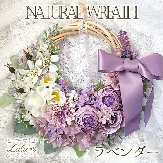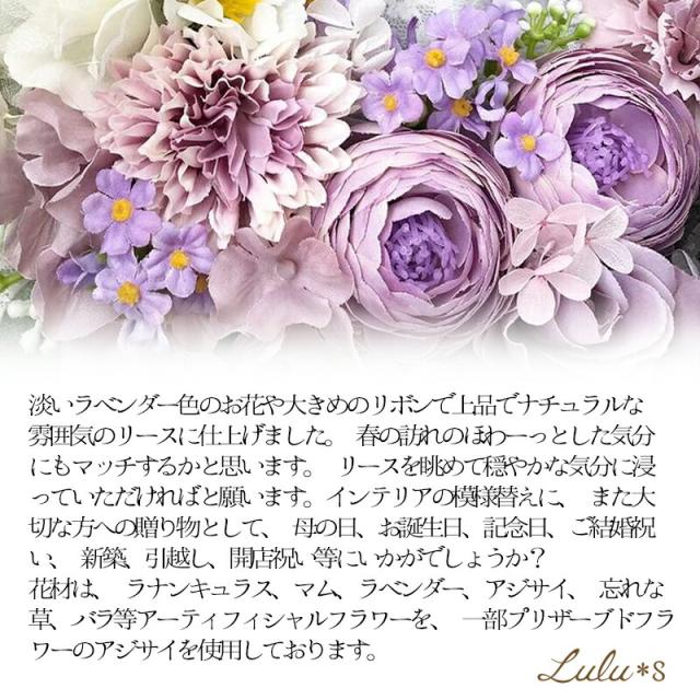 淡いラベンダー色のお花や大きめのリボンで上品でナチュラルな 雰囲気のリースに仕上げました。