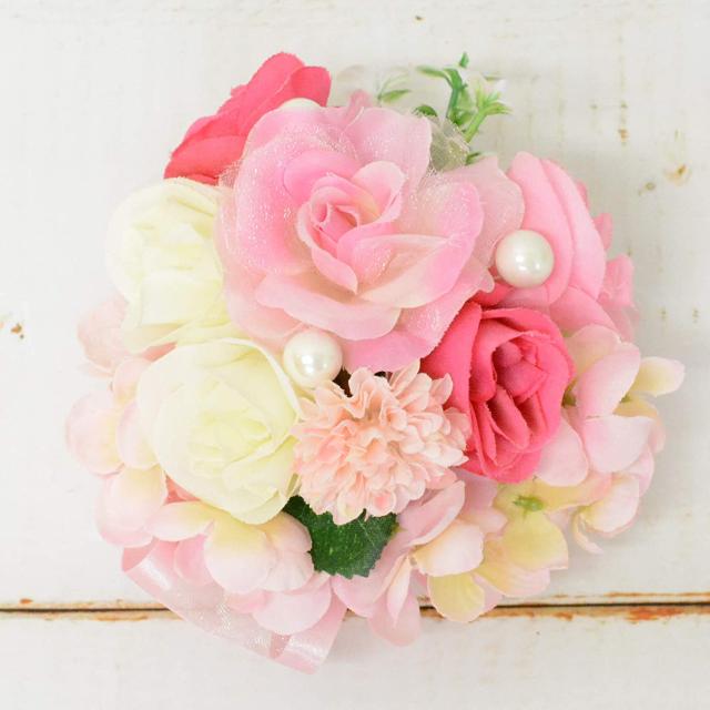 アーティフィシャルフラワーです。 12センチ×11センチ ピンクバラ、ホワイトバラ、濃ピンクバラ アジサイ、パールピン、リボン ピンとクリップの2wayです。