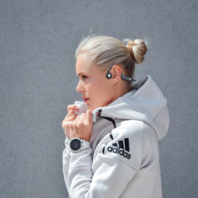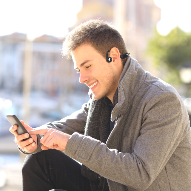耳にかけて使う、耳の周りの骨を震わせて音を伝える骨伝導イヤホンです。