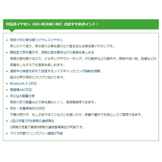 【GREEN HOUSE】骨伝導 ワイヤレス イヤホン GH-BCANC-BK【Bluetooth 5.3 防水 防塵 IP55対応 ノイズキャンセリング ワイヤレスイヤフォン イヤフォン スポーツ ランニング マイク内蔵 グリーンハウス ギフト 母の日 父の日 敬老の日 クリスマス Xmas】