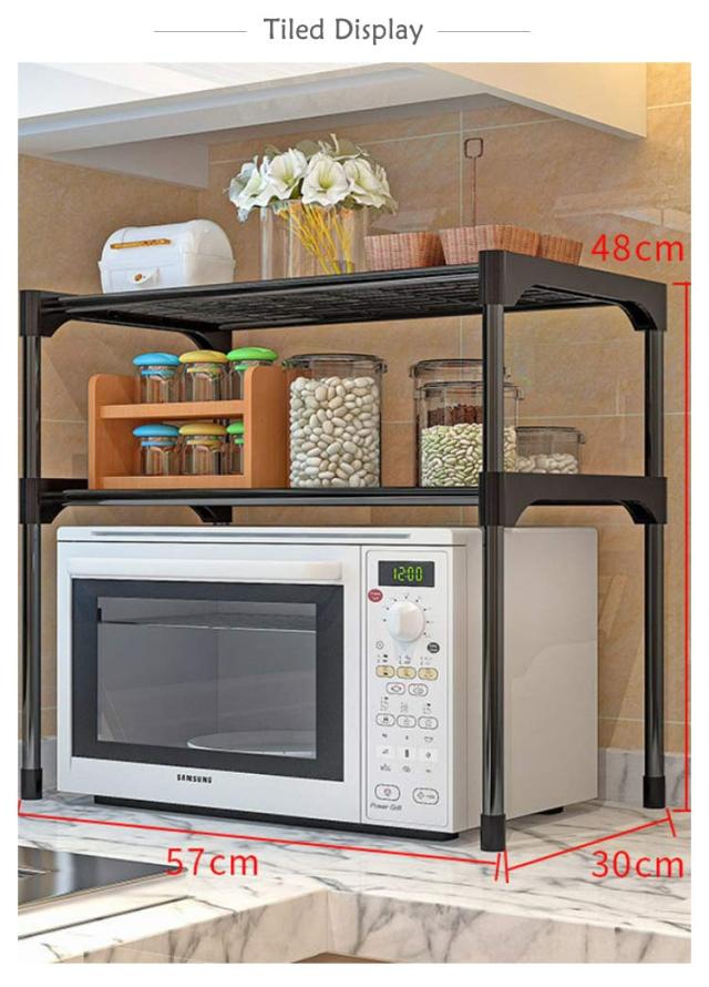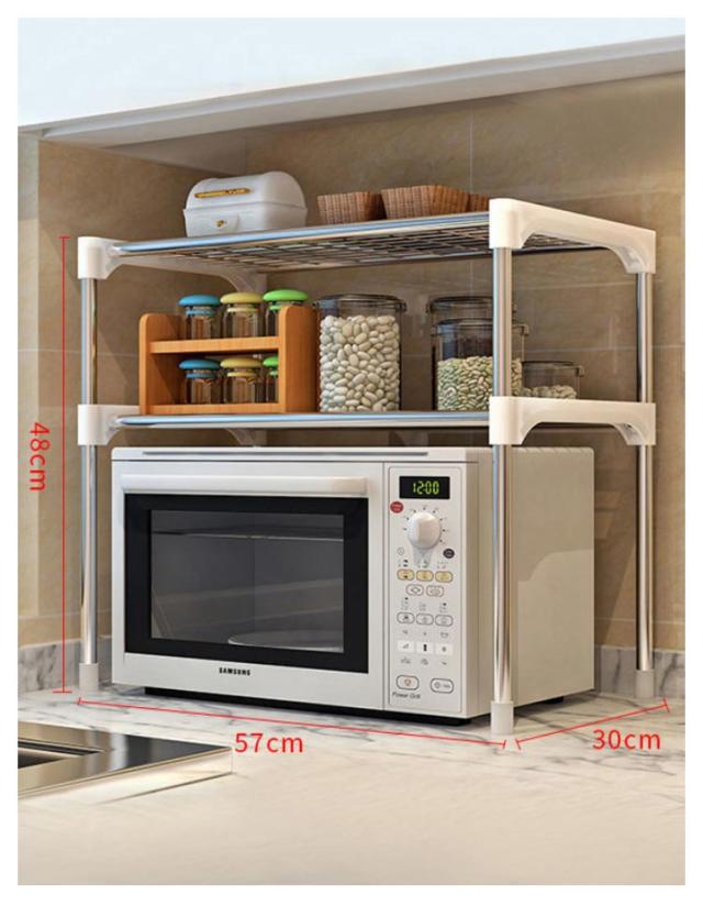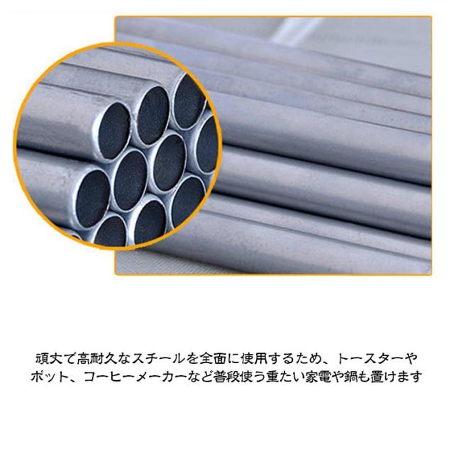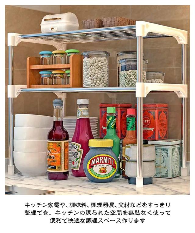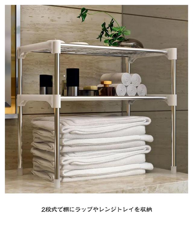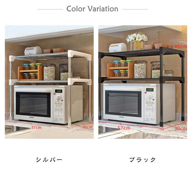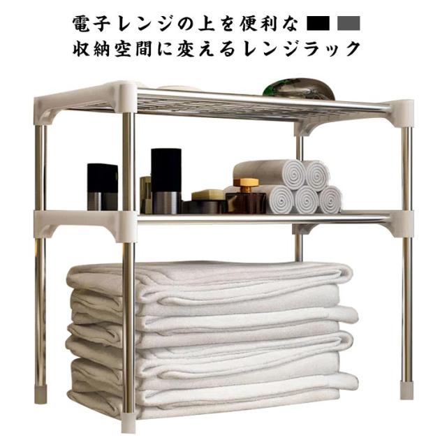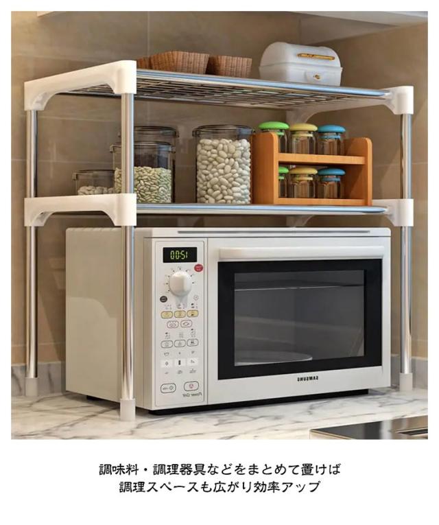 | 電子レンジの上を便利な収納空間に変えるレンジラック。 調味料・調理器具などをまとめて置けば、調理スペースも広がり効率アップ。 2段式で棚にラップやレンジトレイを収納 頑丈で高耐久なスチールを全面に使用するため、トースターや、ポット、コーヒーメーカーなど普段使う重たい家電や鍋も置けます。 表面は粉体塗装加工を施してあるので、水・汚れ・キズ・熱に強くお手入れ簡単。 キッチン家電や、調味料、調理器具、食材などをすっきり整理でき、キッチンの限られた空間を無駄なく使って、便利で快適な調理スペース作ります | |