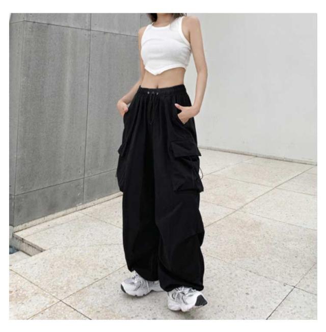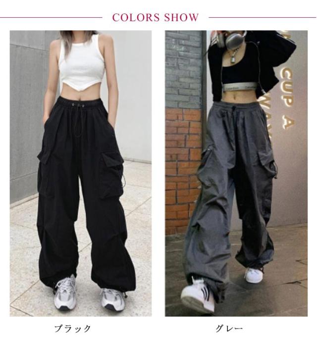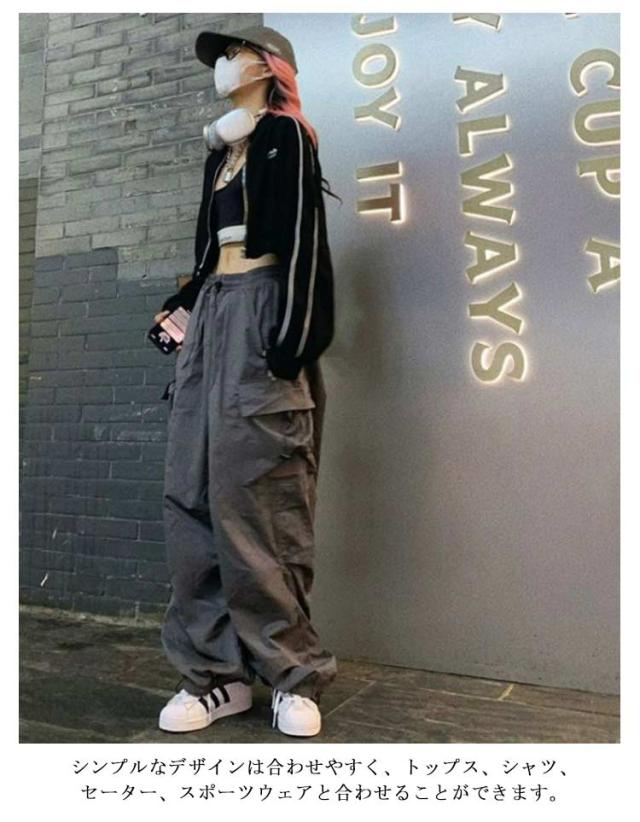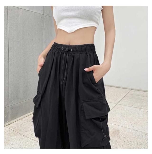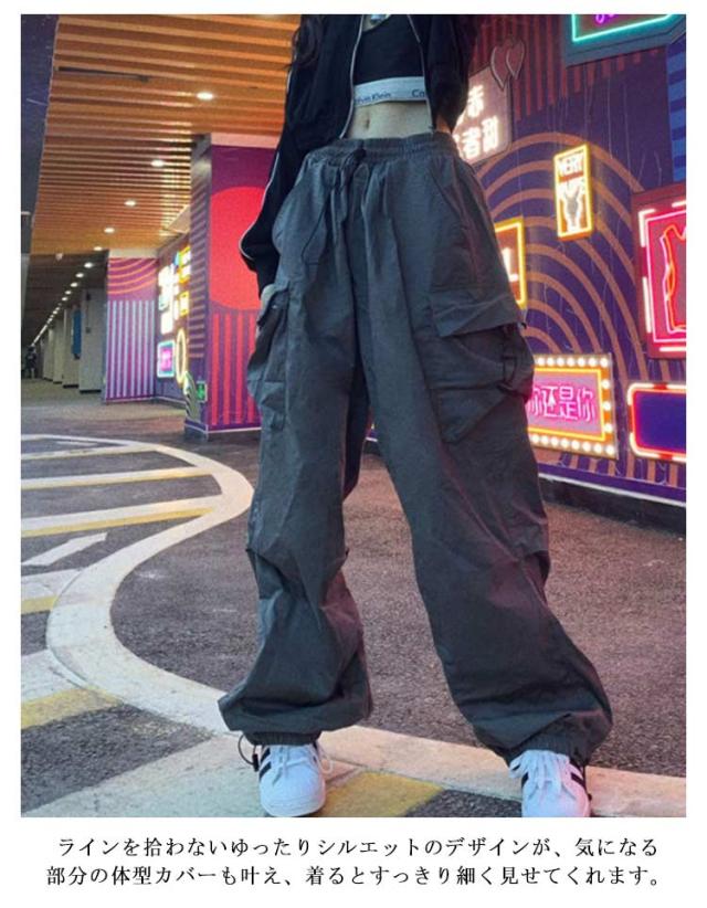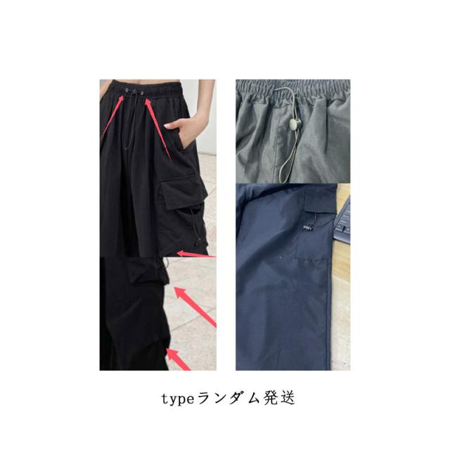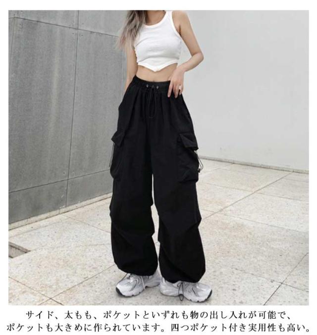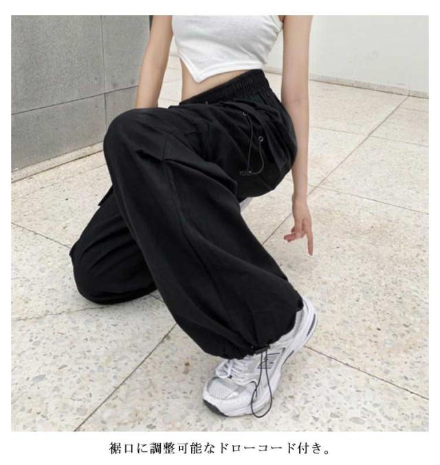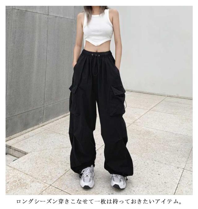 春 ルーズ 薄手 レディース ワイド ゆったり カジュアル ボトムス ズボン メンズライク かわいい シンプル 無地 楽 動きやすい 女性用 カーゴパンツ 黒 秋 10分丈 サイドポケット スナップボタン ウエストゴム ドローコード 調節 作業着 おしゃれ
