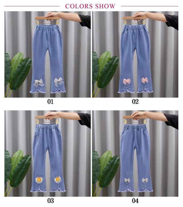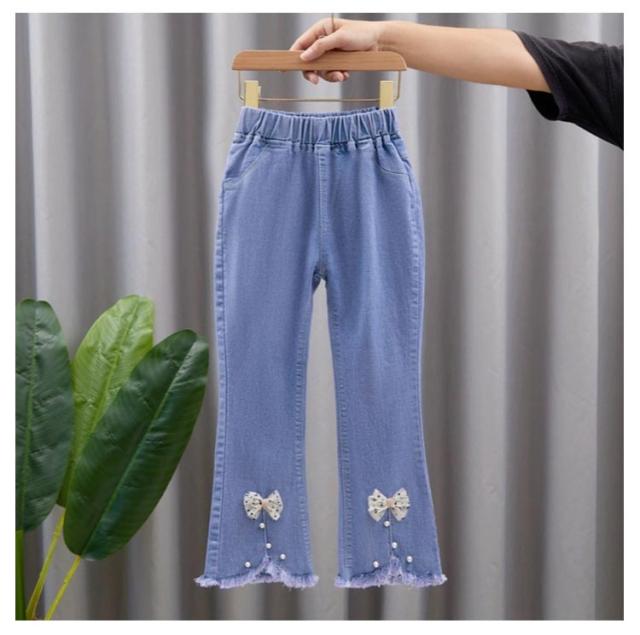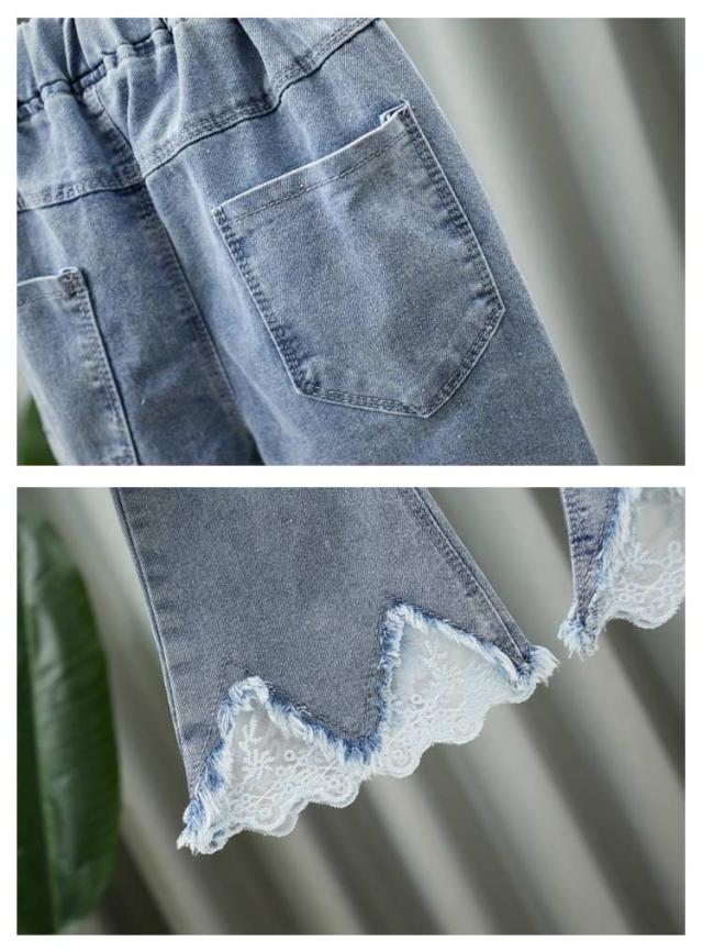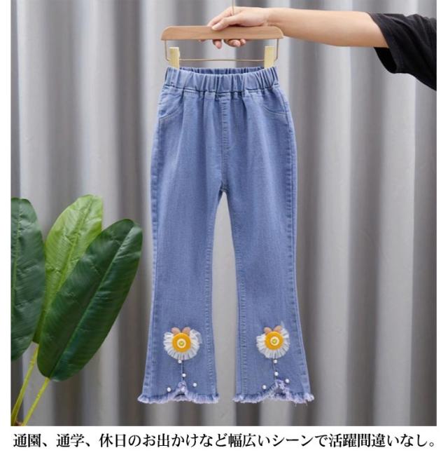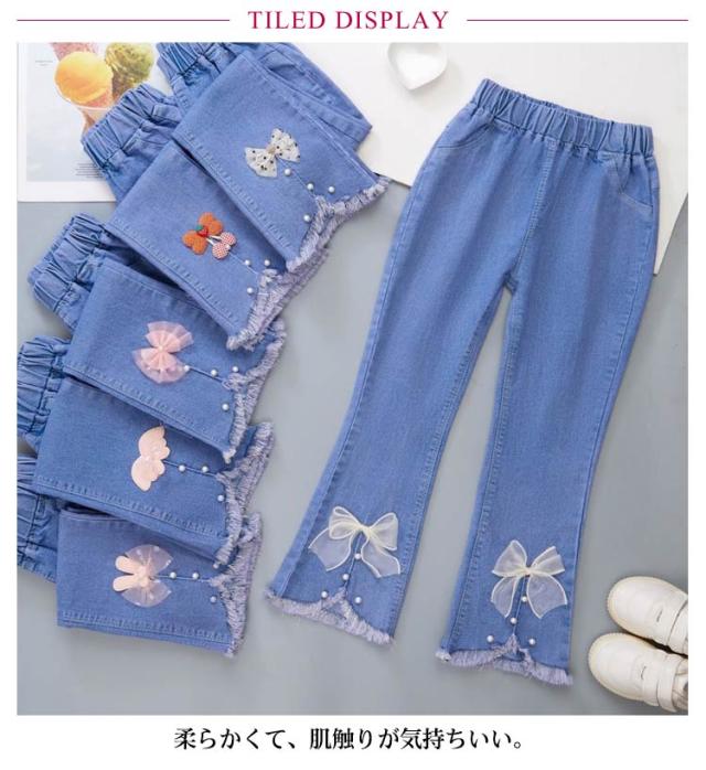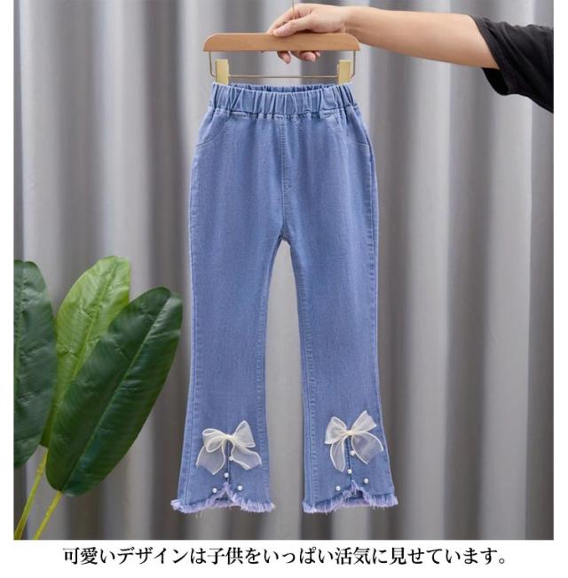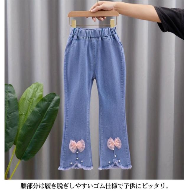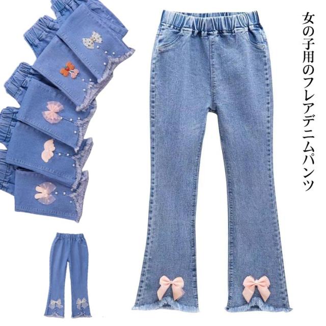子供 春服 スリット リボン フレアパンツ ダメージ ジーパン デニム 裾フレア パンツ デニム ボトムス レース付き キッズ 120cm ジーンズ デニム ロングパンツ デニムパンツ 子供 ズボン パンツ 秋服 冬服 110cm 女の子 130cm 140cm ダメージ