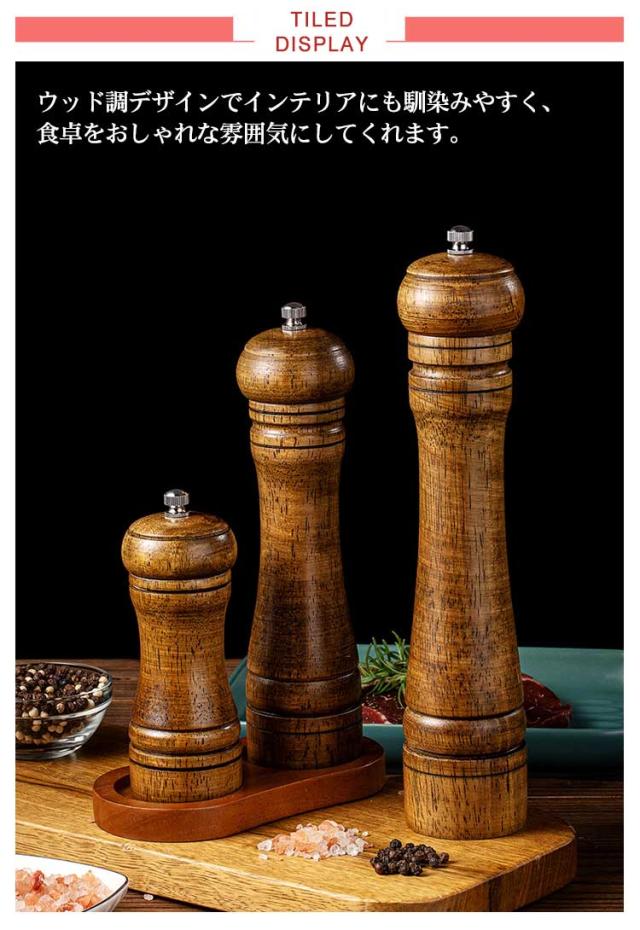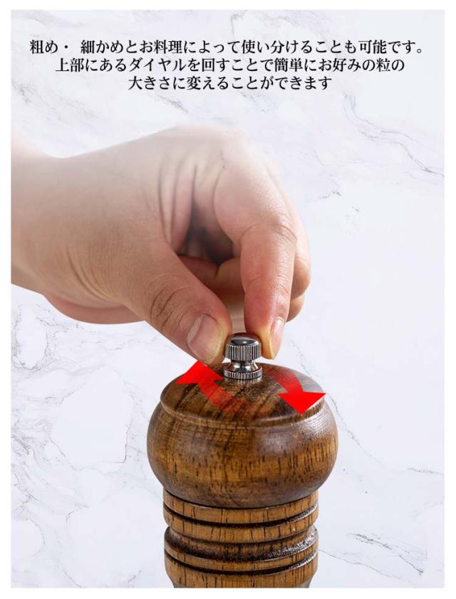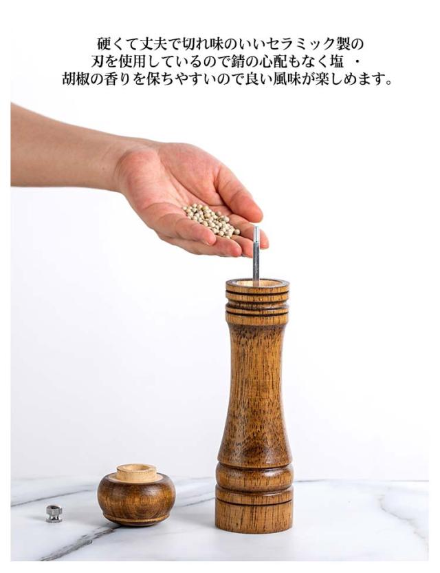 | ウッド調デザインでインテリアにも馴染みやすく、食卓をおしゃれな雰囲気にしてくれます。 ペッパー・結晶塩・コショウ・唐辛子・山椒など数多くの調味料に適用できます。 粗め・ 細かめとお料理によって使い分けることも可能です。上部にあるダイヤルを回すことで簡単にお好みの粒の大きさに変えることができます 硬くて丈夫で切れ味のいいセラミック製の刃を使用しているので錆の心配もなく塩 ・ 胡椒の香りを保ちやすいので良い風味が楽しめます。 | |