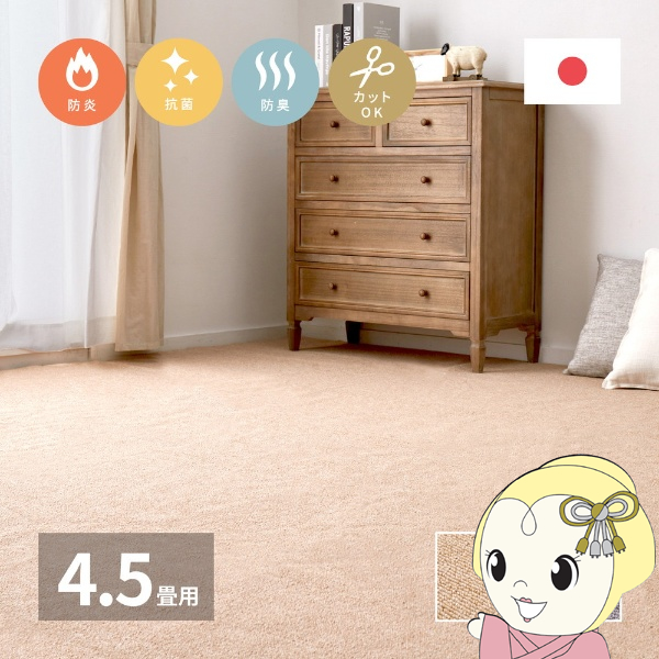 火が点きにくく、万が一火が点いても自己消火性があるため燃え広がりにくい、防炎加工カーペット。 日本防炎協会の防炎性試験に合格。消防検査対応の防炎シール付きで、防炎製品の使用が義務付けられている施設などにも使用できます。 ふかふかとした肌触りで、弾力があり復元性に優れていてへたりにくく、毛羽立ち感のないループパイル。 ■サイズ(cm):261×261(江戸間4.5帖) ■カラー:ベージュ ■組成:ポリプロピレン100% ■機能:防炎・抗菌・防臭 ■洗濯:不可 ■厚み(mm):6 ■すべり止め:なし ■ホットカーペット・床暖房:対応 ■原産国:日本 ※写真はメーカー様のカタログ等から掲載させて頂いております。 実物の商品と写真の色が若干写真写り等により異なる場合がありますのでご注意くださいませ。 万が一の際でございましても返品はお受け致しかねます。 ※記載は商品仕様の一部です。仕様説明不足等の理由での返品はできません。特に適合等は必ずご確認ください。