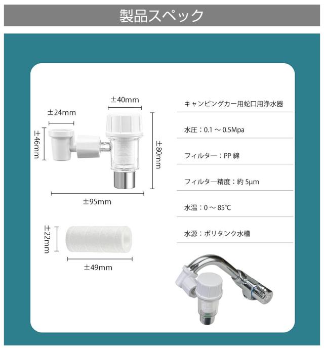 水圧:0.1〜0.5Mpa フィルター素材:PP綿 フィルター精度:約5μm 対応水温:0〜85度 |