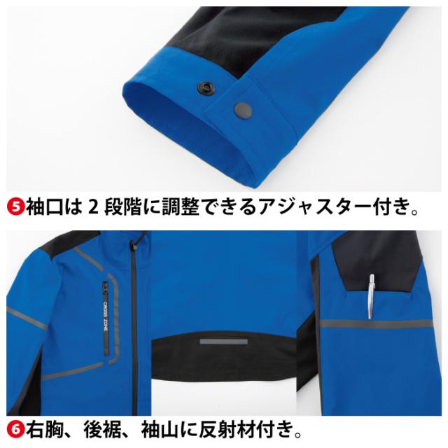 ◇機能:動きやすい2WAYストレッチ。立体的なヒジの設計でさらに動きやすく。両胸ファスナーポケット。左袖マルチポケット。袖口は2段階に調整できるアジャスター付き。右胸・後裾・袖山に反射材付き。襟前部分が低く顎にあたりにくい。