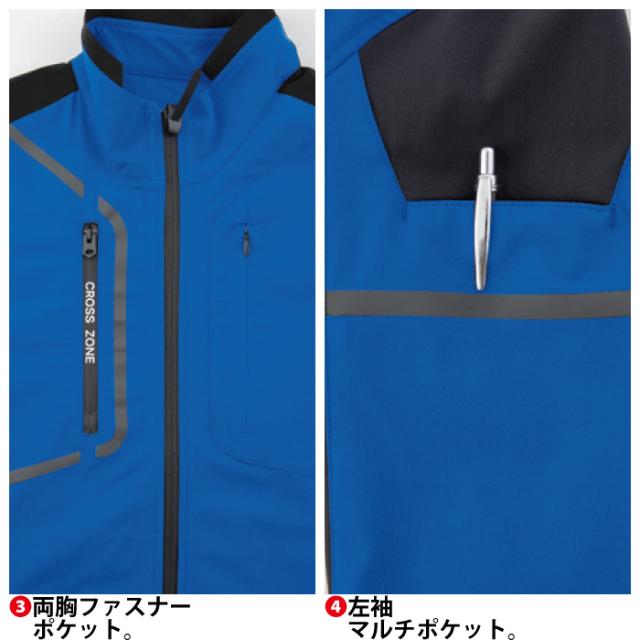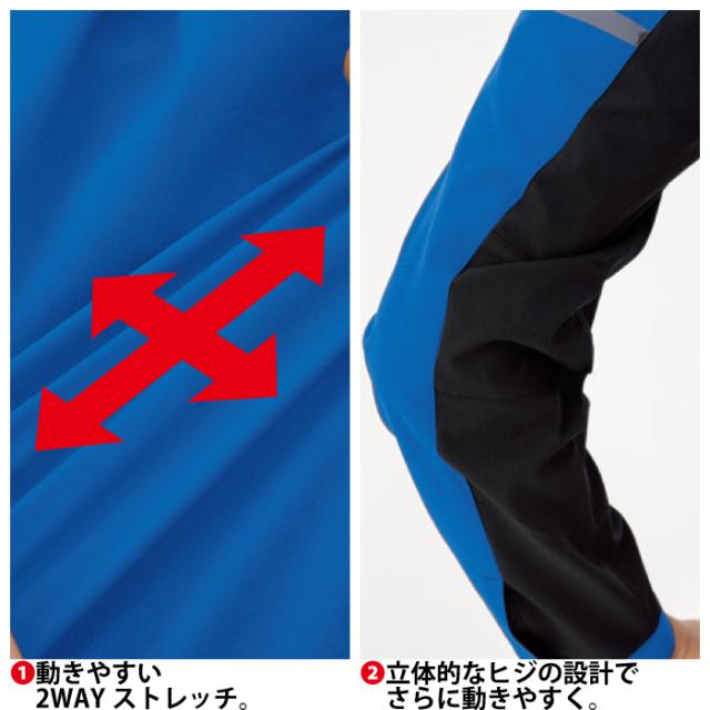 ◇機能:動きやすい2WAYストレッチ。立体的なヒジの設計でさらに動きやすく。両胸ファスナーポケット。左袖マルチポケット。袖口は2段階に調整できるアジャスター付き。右胸・後裾・袖山に反射材付き。襟前部分が低く顎にあたりにくい。