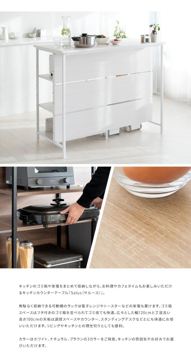 キッチンのゴミ箱や家電をまとめて収納しながら、お料理やカフェタイムもお楽しみいただけるキッチンカウンターテーブル『Salus(サルース)』。