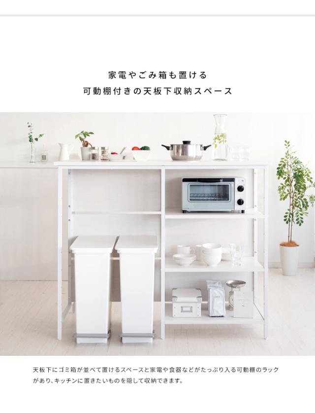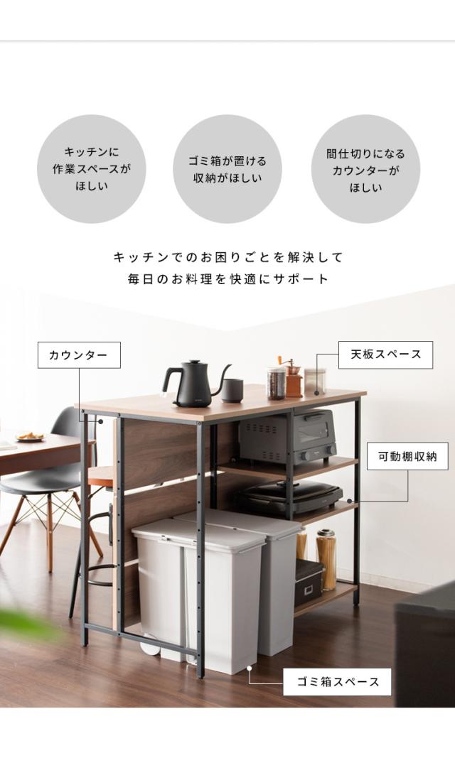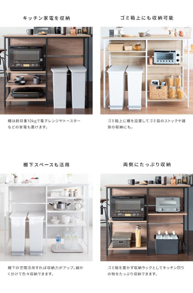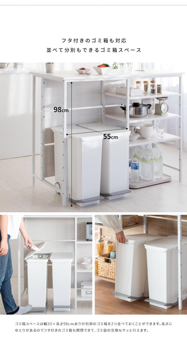 無駄なく収納できる可動棚のラックは電子レンジやトースターなどの家電も置けます。ゴミ箱スペースはフタ付きのゴミ箱を並べられてゴミ捨ても快適。