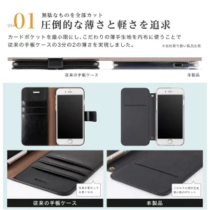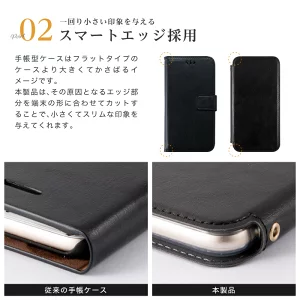 手帳型ケースはフラットタイプのケースより大きくてかさばるイメージです。 本製品は、その原因となるエッジ部分を端末の形に合わせてカットすることで、小さくてスリムな印象を与えてくれます。