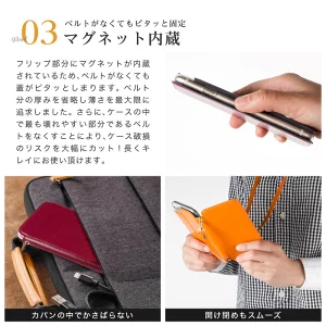 フリップ部分にマグネットが内蔵されているため、ベルトがなくても蓋がピタッとしまります。 ベルト分の厚みを省略し薄さを最大限に追求しました。 さらに、ケースの中で最も壊れやすい部分であるベルトをなくすことにより、ケース破損のリスクを大幅にカット!長くキレイにお使い頂けます。