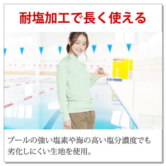 耐塩素、耐塩水加工を施しているので、プールの高濃度の塩素や海水に長時間晒されても生地が傷まず長く着られるのも嬉しい。