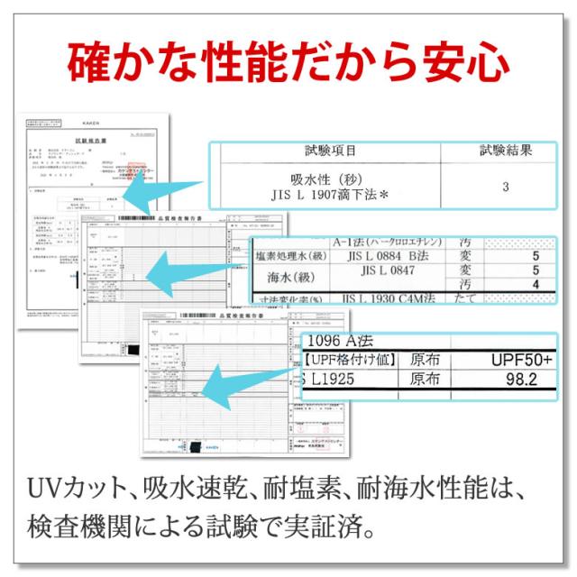 UVカット、吸水速乾、耐塩素、耐海水性能は検査機関で試験済。