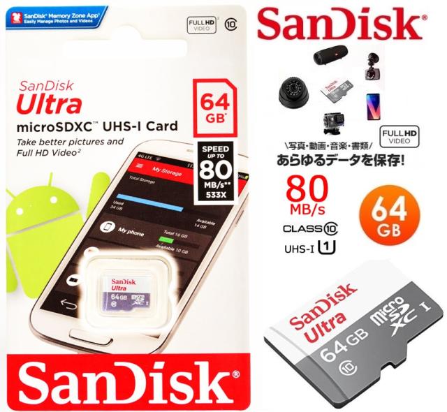 64GB サンディスク Ultra microSDXCメモリ 64GB Class10 UHS-I対応80MB/s SanDisk マイクロSDカード SDSQUNS-064G-GN3MN FullHD対応