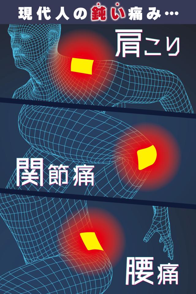 腰痛、肩こりに伴う肩の痛み、関節痛、筋肉痛、腱鞘炎(手・手首の痛み)、肘の痛み(テニス肘など)、打撲、捻挫