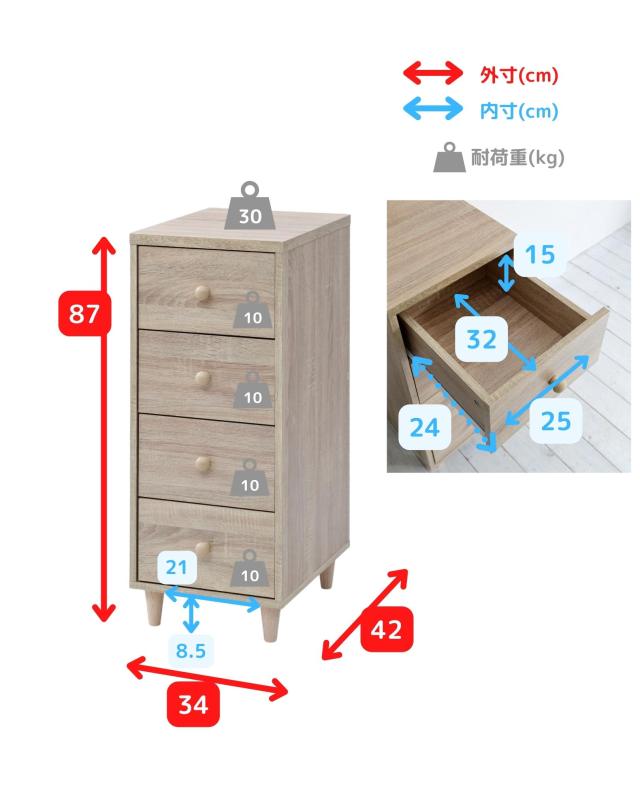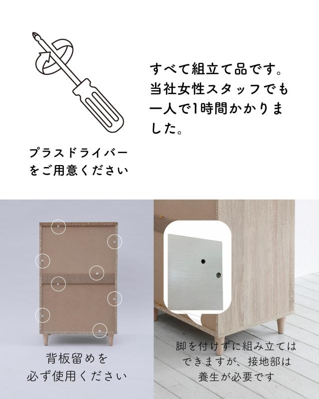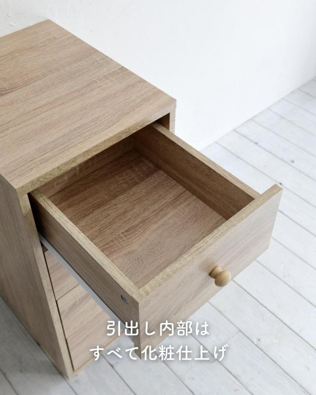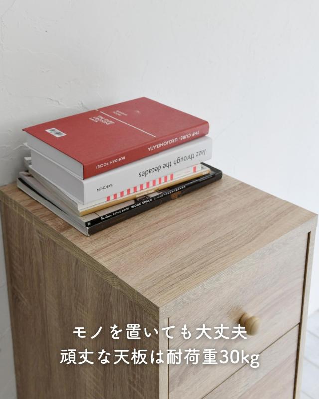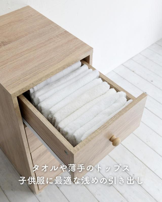 | 商品説明 | ●※組立式です。女性スタッフで約1時間かかりました。 ※プラスドライバーをご用意ください。 ※開梱直後、材料の繊維板の匂いがこもっていますので、換気をしながら組み立てください。 ●木目柄シートのシンプルな引き出し収納 ●側面は隙間もなく化粧仕上げ、背面は化粧なしで隙間はなく、ホコリの入りにくいつくり ●天板は重いモノを載せてもOK ●引出しは金属レール付きで開け閉めラクラク ●高さ8.5cmで掃除もしやすい、かわいい木製脚付き ●引出し内寸:幅25 奥行32 深さ15cm(側板内寸高さ11cm) ●引出しスライド幅25.5cm ●脚の高さ:約8.5cm ●天板サイズ:幅33.5 奥行42cm ●耐荷重:引出し1段あたり10kg、天板30kg、全体70kg |