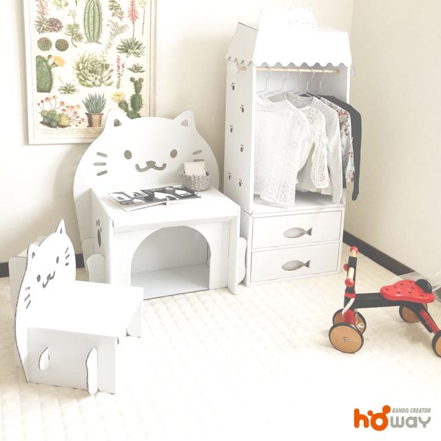 Nekoキッズ家具シリーズに、ダンボールチェスト&ハンガーラックが登場! お昼寝中のネコの下にはかわいいモチーフの大収納ハンガーラック!肉球にフックをつけたりアレンジは無限大! サイドにも帽子やカバンをかけることも出来ます。チェストは開けやすさや閉めやすさを追求し、おこさまが1人で 開閉出来るこだわり設計。チェスト2段でハンガーラックと同じ高さになるように設計されています。 デコしても、落書きしてもOK!ダンボールならではの暖かみでお子様の成長を支えます。