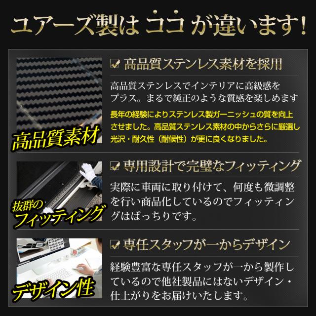 高品質なステンレス素材を使用した、純正のような深い光沢のメッキパーツが登場。 インテリアに高級感をプラスして、ワンランク上のドレスアップを手に入れられます! 実際に車両に取り付け、何度も微調整を行い商品化しているのでフィッティングはバッチリ。 経験豊富な専任スタッフが一から制作しているので他社製品にはないデザイン・仕上がりをお届けいたします! 届いた時点で強力両面テープがメッキ裏面についておりますので、あとは取り付け箇所をしっかり脱脂して貼り付けるだけでOKです! 必要に応じて付属のマスキングテープや両面テープを使用してください。 |
