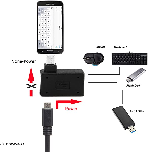90度左アングルMicro USB 2.0OTGホストアダプタとUSB電源のGalaxy s3s4s5note2note3用スマホとタブレットなどに、このUSBホストアダプタで、USBメモリースティックに接続すると、USB 2.0メモリカードリーダー、またはキーボードをタブレットとスマホ。