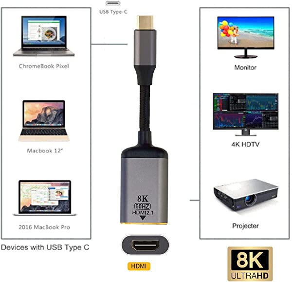 金メッキUSB-CからHDMIモニターケーブルビデオ8K、4K UHD 2160p、HD 1080p、コネクタ、錫メッキ銅線、耐久性のあるナイロン編組、アルミスリムケースで、デバイス間の強度の接続をサポートします。