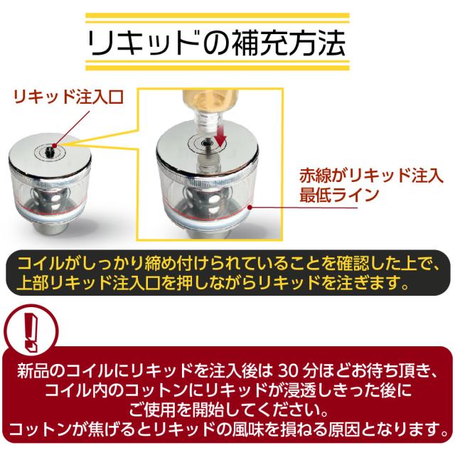 ※新品のコイルにリキッドを注入後は30分ほどお待ち頂き、コイル内のコットンにリキッドが浸透しきった後にご使用を開始してください。