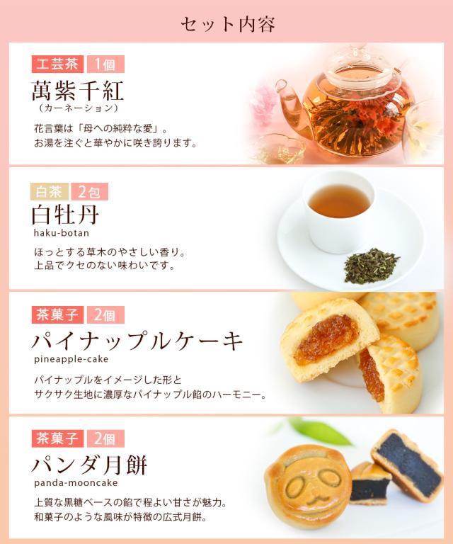 | 内 容 量 | ・工芸茶(カーネーション)×1個 ・白牡丹 (2.5g)×2P ・パイナップルケーキ ×2個 ・パンダ月餅 ×2個 ・お茶の淹れ方のしおり 1枚 |